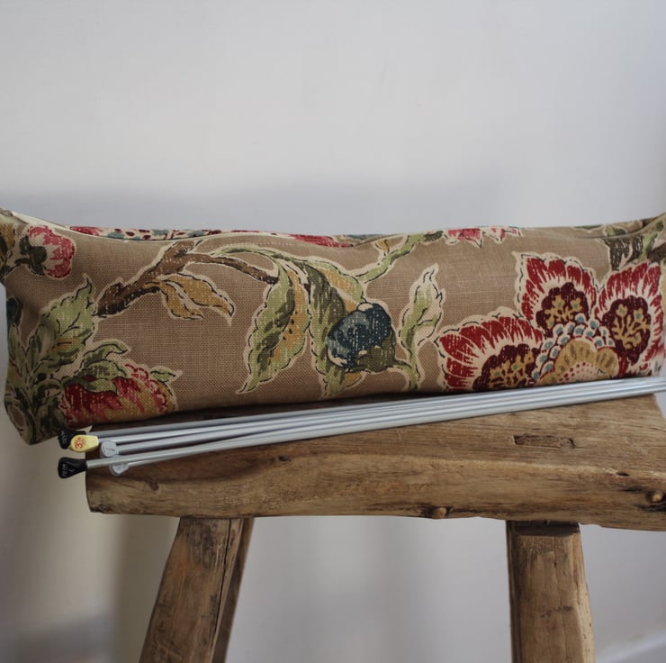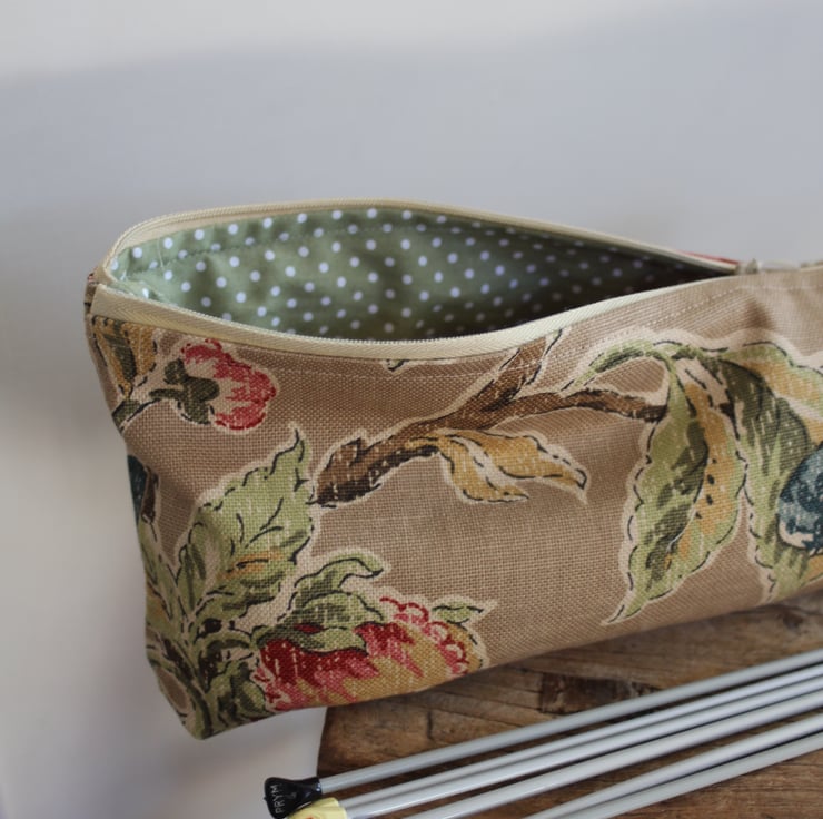 I found this fabric in an antiques shop a few years ago as I knew it would make fabulous shopping bags. I had some little remnants leftover and squirrelled them away until I could think of a way to use them. A couple of weeks ago I needed a birthday present for an old school friend and trialled a similar make-up bag. She was thrilled with it and so I decided to stitch another which sold straight away. This is the last remnant and thought it would make a perfect knitting needle holder.