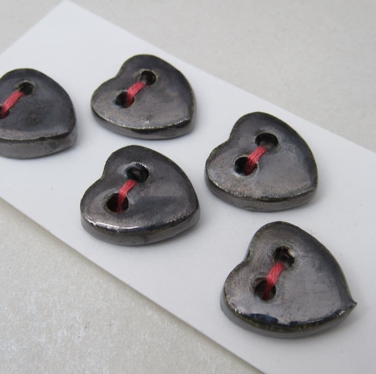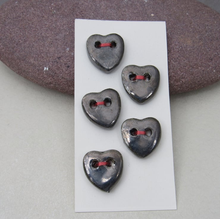 5 small stoneware heart buttons finished with a metallic silver glaze.