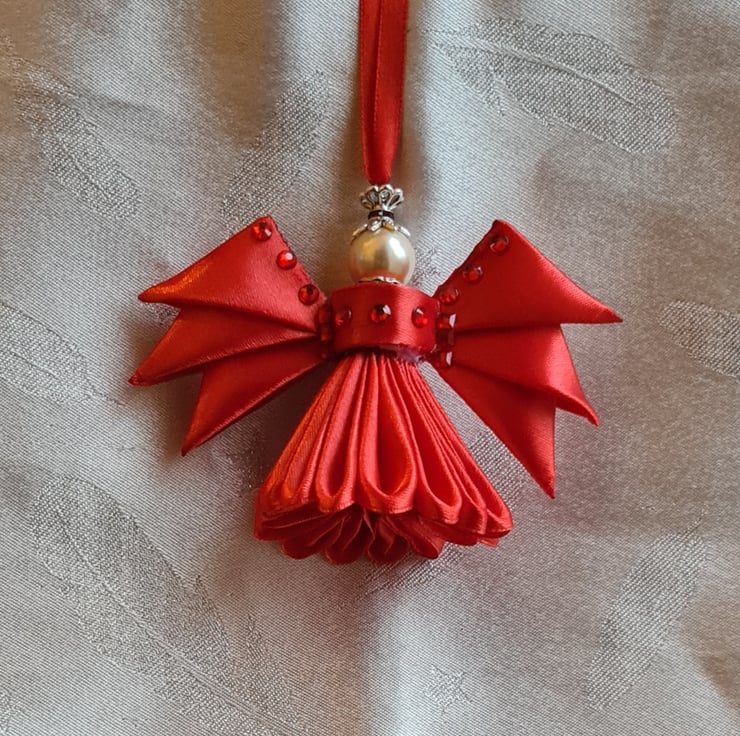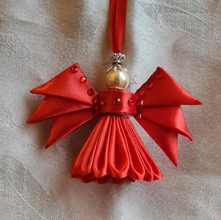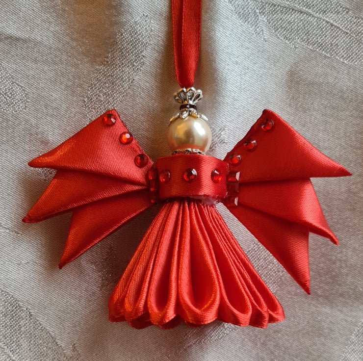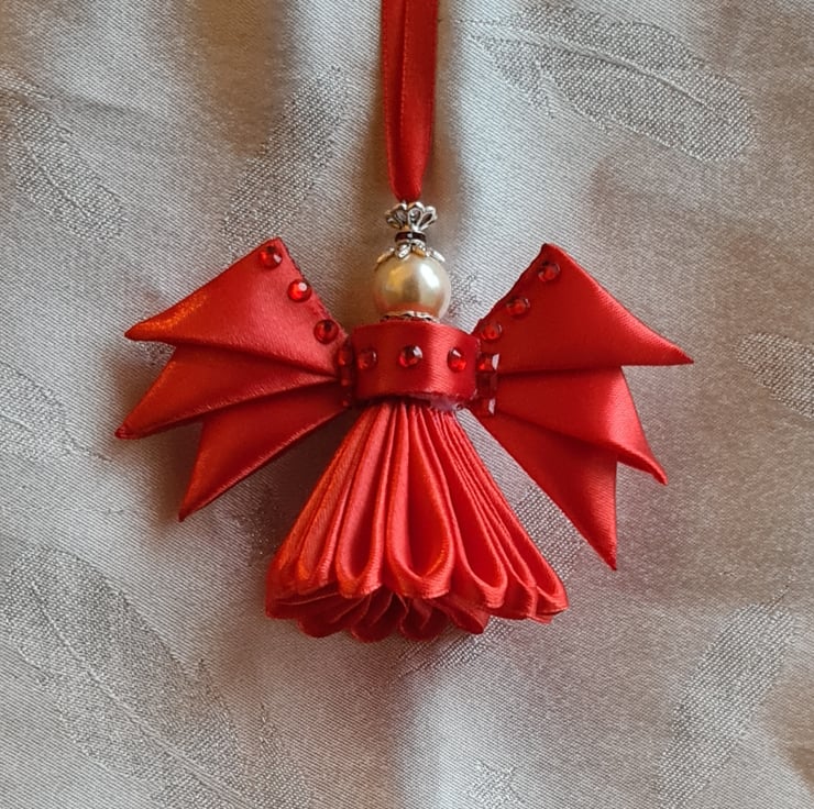 Please note this is NOT A TOY. Keep away from babies, young children and pets due to small parts. If any part is ingested seek medical treatment/advice immediately. Misuse can cause breakage. Keep away from naked flames/candles/cigarettes etc as these can melt/burn/damage your Ribbon Angel. Ribbon Angels contain a central wire in their core, do not bend wire or Angel as this can weaken/break wire/damage Angel figure. As with all handmade items there may be some small imperfections (such as glue drips/spots, colour variations and slight styling variations). Misuse may cause breakage. These items are for ornamental use only. Materials Red ribbon, ivory colour glass pearl bead. Red Acrylic gems. Bead caps. Floral Wire. Hot glue. Double sided tape.