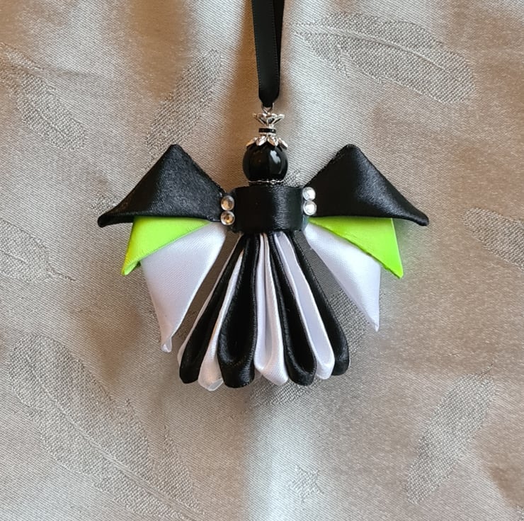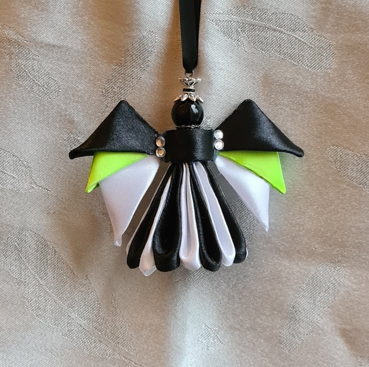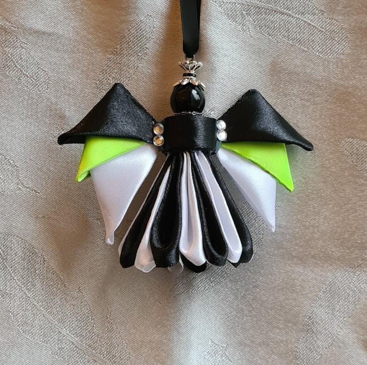 Please note this is NOT A TOY. Keep away from babies, young children and pets due to small parts. If any part is ingested seek medical treatment/advice immediately. Misuse can cause breakage. Keep away from naked flames/candles/cigarettes etc as these can melt/burn/damage your Ribbon Angel. Ribbon Angels contain a central wire in their core, do not bend wire or Angel as this can weaken/break wire/damage Angel figure. As with all handmade items there may be some small imperfections (such as glue drips/Heat spots, colour variations and slight styling variations, fabric catches etc). Misuse may cause breakage. These items are for ornamental use only. Materials Black satin ribbon.White satin ribbon. Neon Green satin ribbon. Black glass pearl bead. Bead caps. Clear acrylic gems. Floral Wire. Hot glue, Double sided tape.