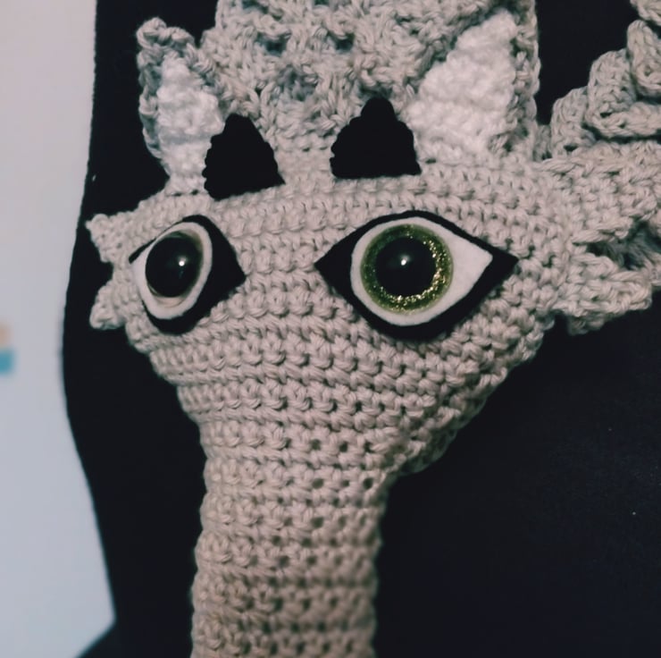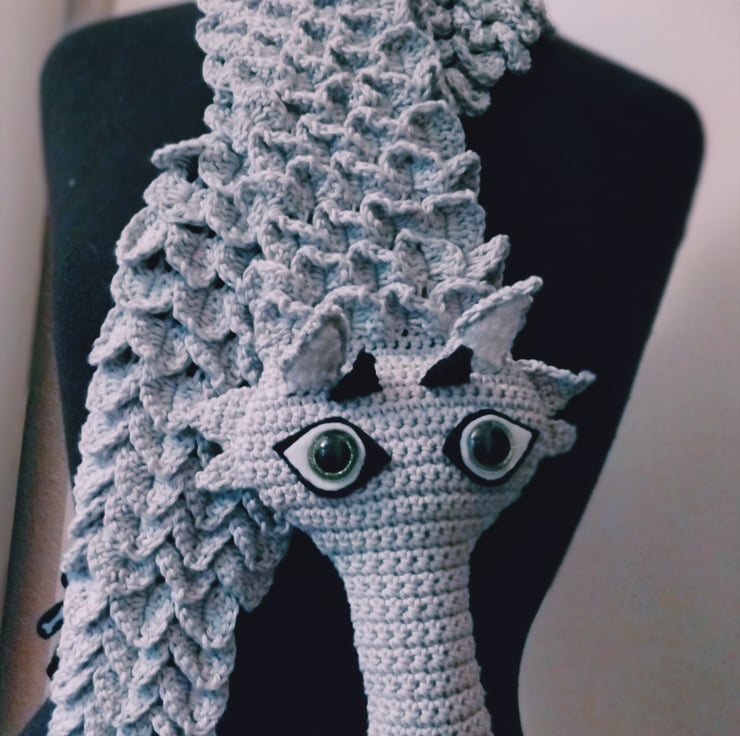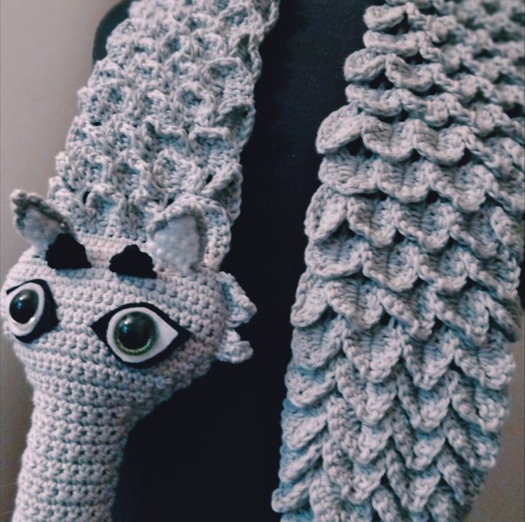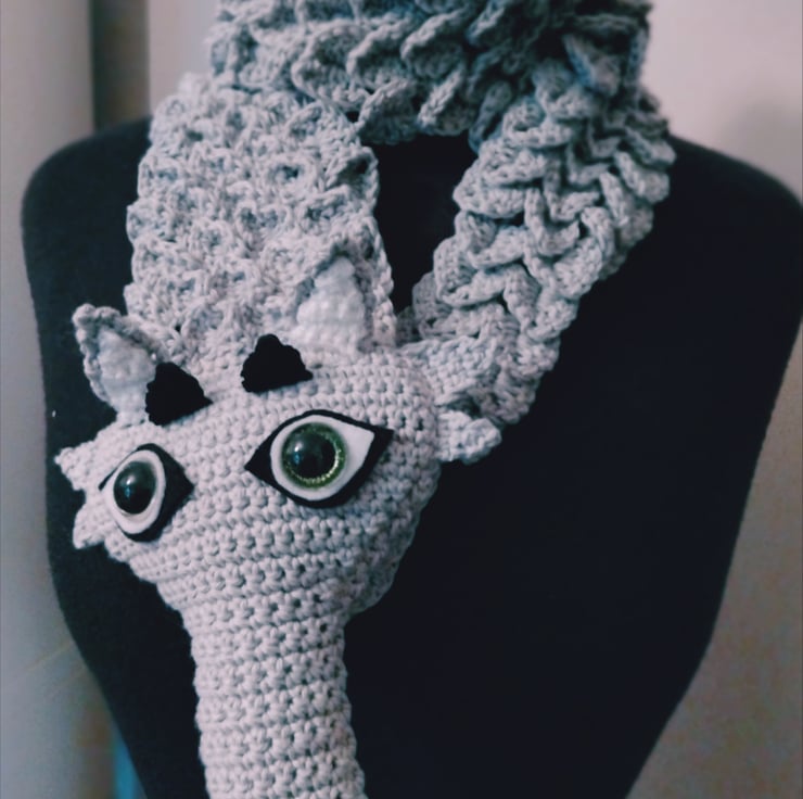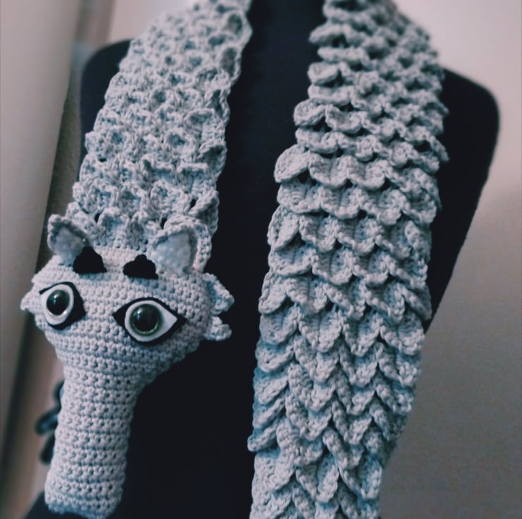 Striking grey dragon stole crochet in cotton yarn.