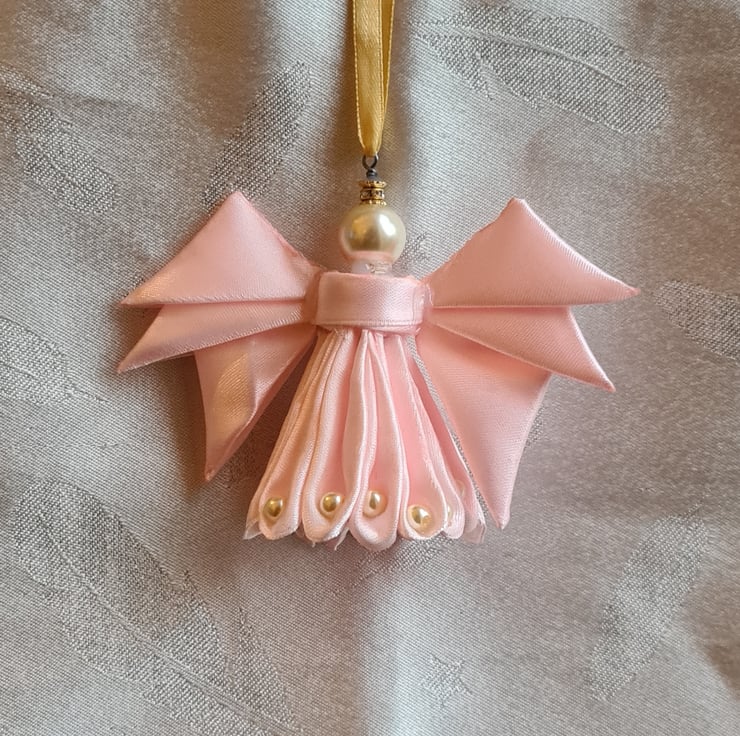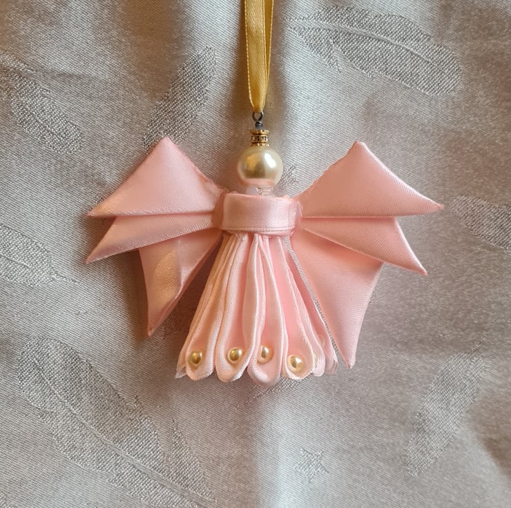 Please note this is NOT A TOY. Keep away from babies, young children and pets due to small parts. If any part is ingested seek medical treatment/advice immediately. Misuse can cause breakage. Keep away from naked flames/candles/cigarettes etc as these can melt/burn/damage your Ribbon Angel. Ribbon Angels contain a central wire in their core, do not bend wire or Angel as this can weaken/break wire/damage Angel figure. As with all handmade items there may be some small imperfections (such as glue drips/heat spots, colour variations and slight styling variations). Misuse may cause breakage. These items are for ornamental use only. Materials. Baby Pink Ribbon. Light Gold Glass Pearl Beads. Floral Wire. Bead caps. Hot Glue. Double sided tape.