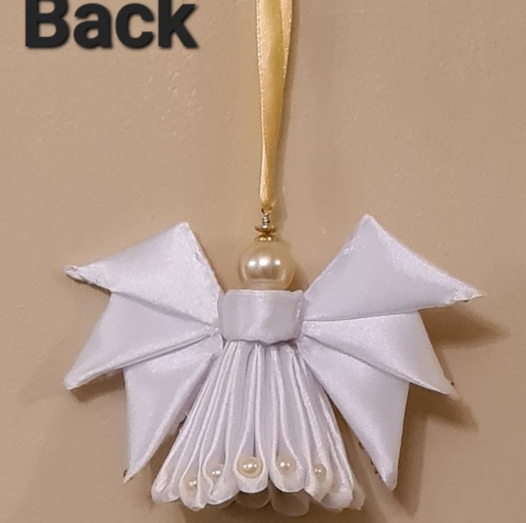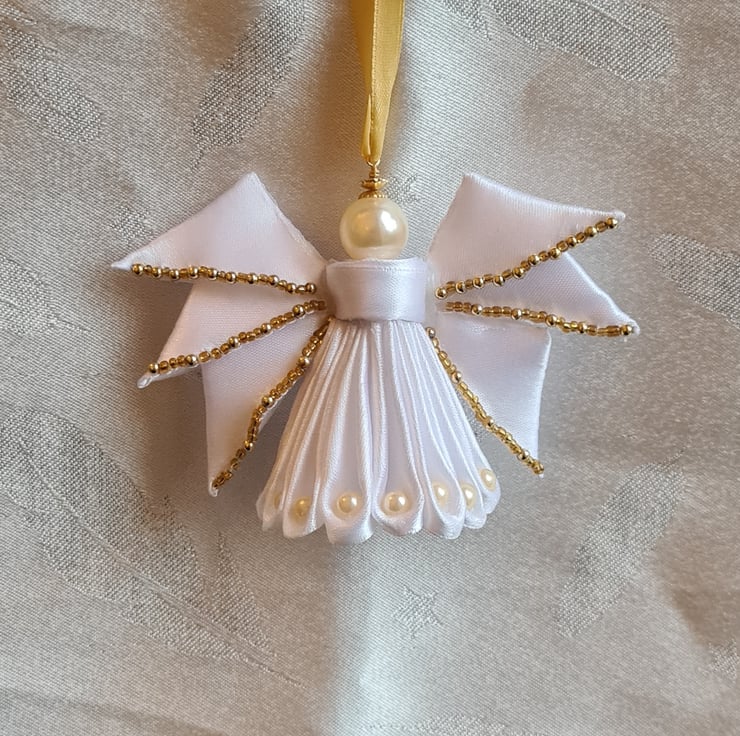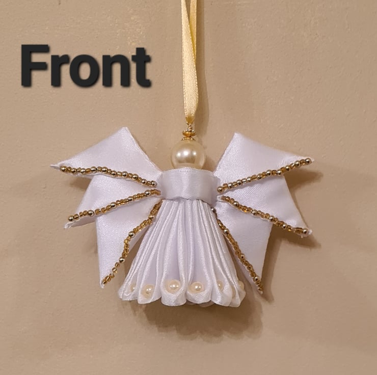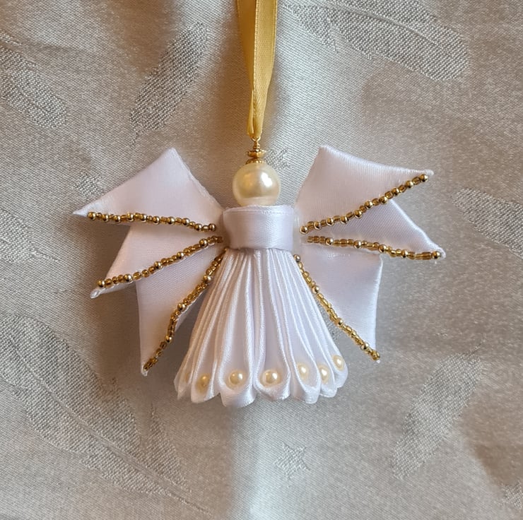 Please note this is NOT A TOY. Keep away from babies, young children and pets due to small parts. If any part is ingested seek medical treatment/advice immediately. Misuse can cause breakage. Keep away from naked flames/candles/cigarettes etc as these can melt/burn/damage your Ribbon Angel. Ribbon Angels contain a central wire in their core, do not bend wire or Angel as this can weaken/break wire/damage Angel figure. As with all handmade items there may be some small imperfections (such as glue drips/spots, colour variations and slight styling variations). Misuse may cause breakage. These items are for ornamental use only. Materials. White Satin Ribbon. Gold Ribbon. Light Gold Glass Pearl Beads. Gold metal beads. Gold glass beads. Hot Glue. Double sided tape.