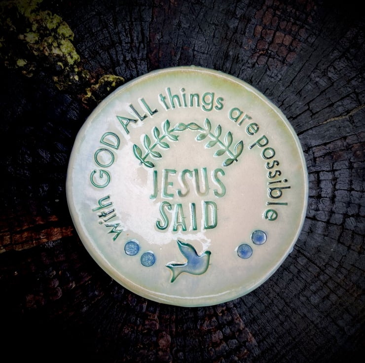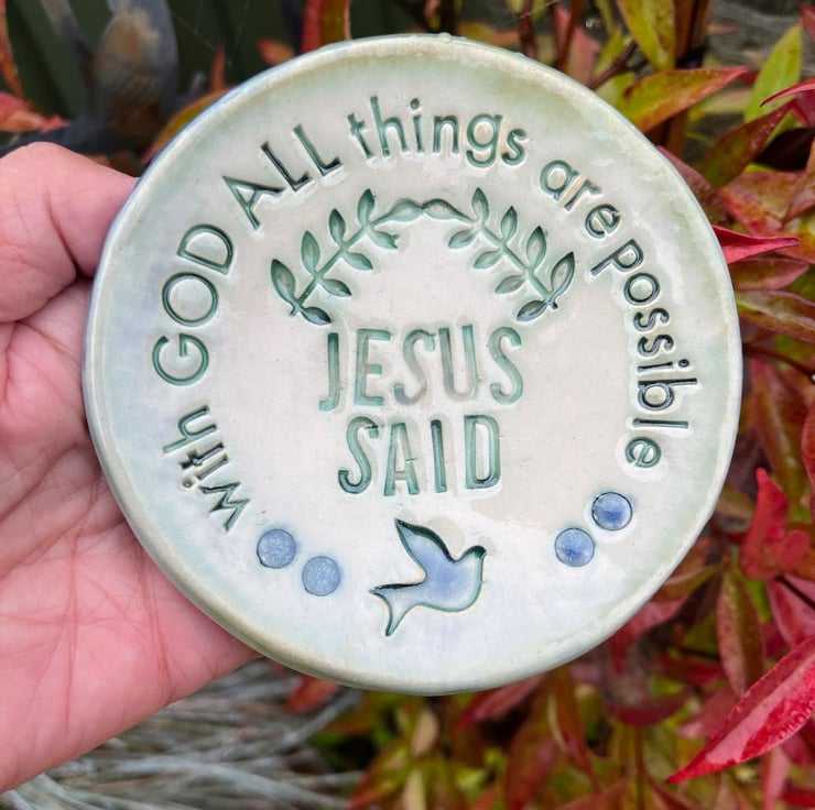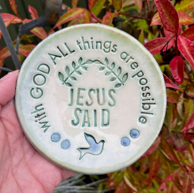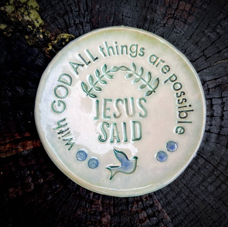A lovely ceramic dish with an impressed bible verse – Jesus said – with God all things are possible- Matthew 19:26