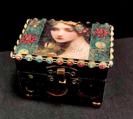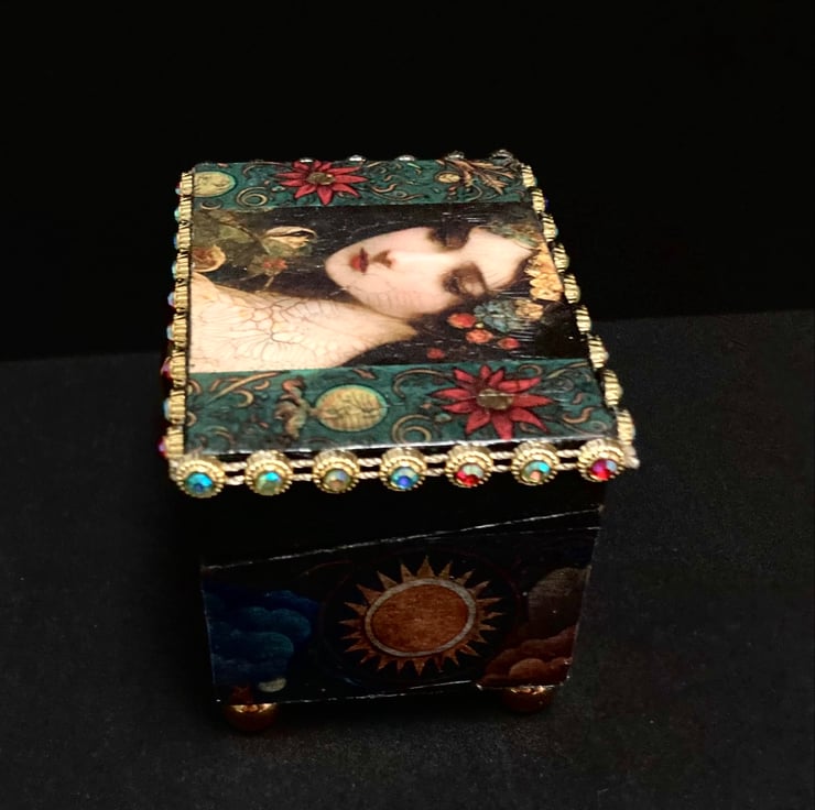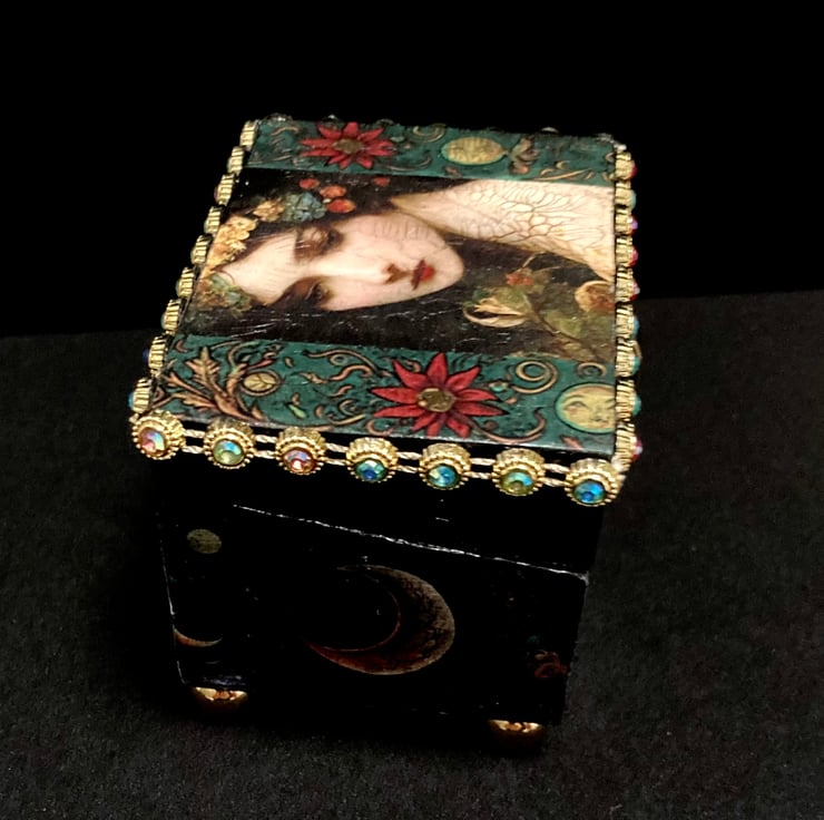 The lid has an image of a beautiful woman with a floral head dress and I have added a border of deep green with red flowers and moons.