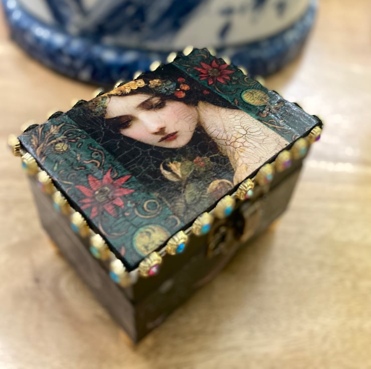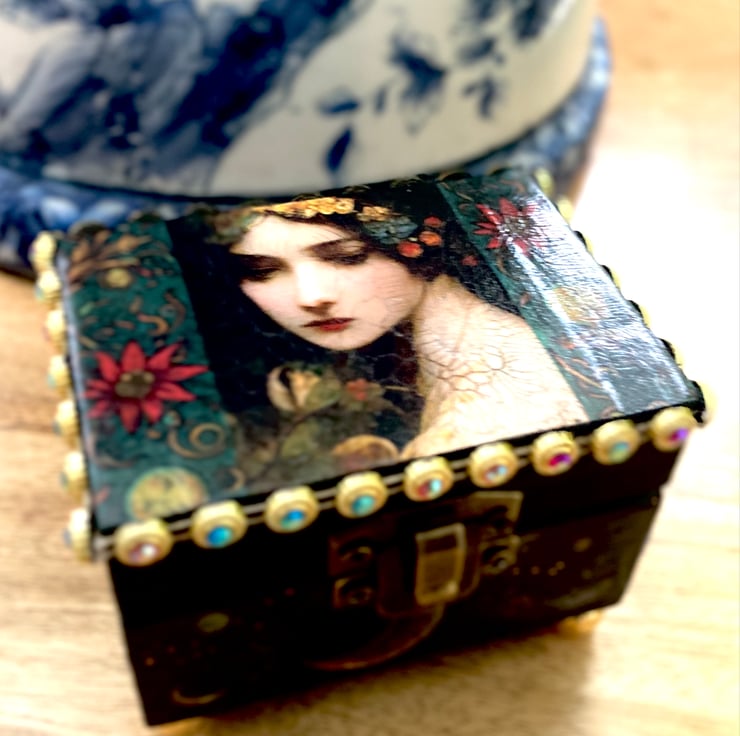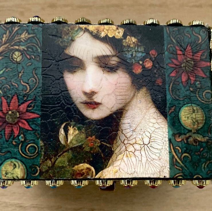 The lid is crackle glazed with craquelure which gives very fine cracks and creates a gorgeous vintage look, like old porcelain. This gives the box character and charm and evokes antique oil paintings
