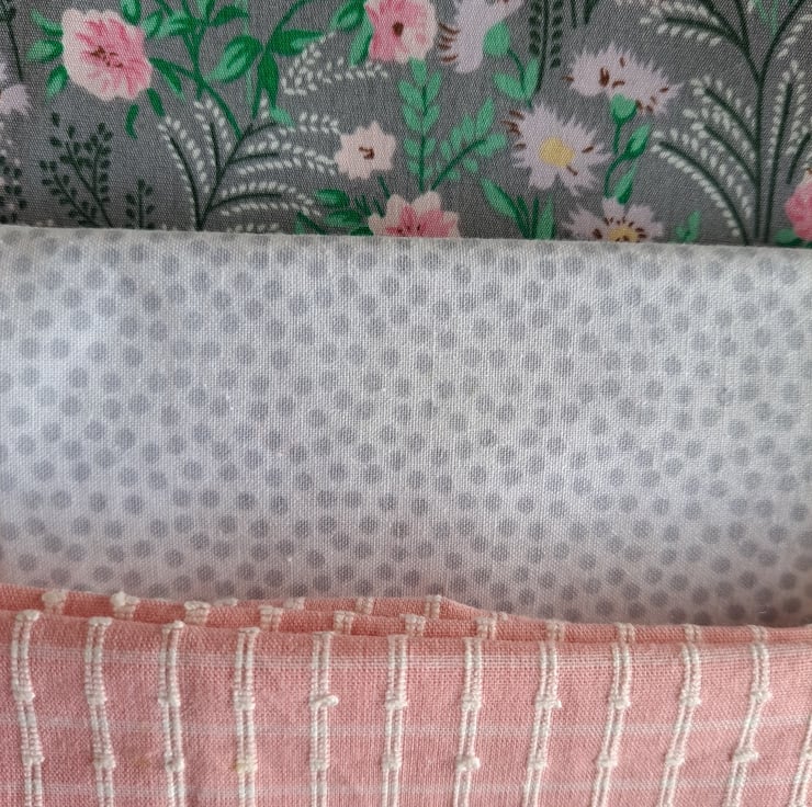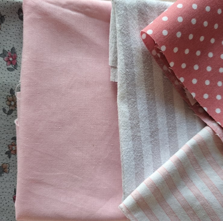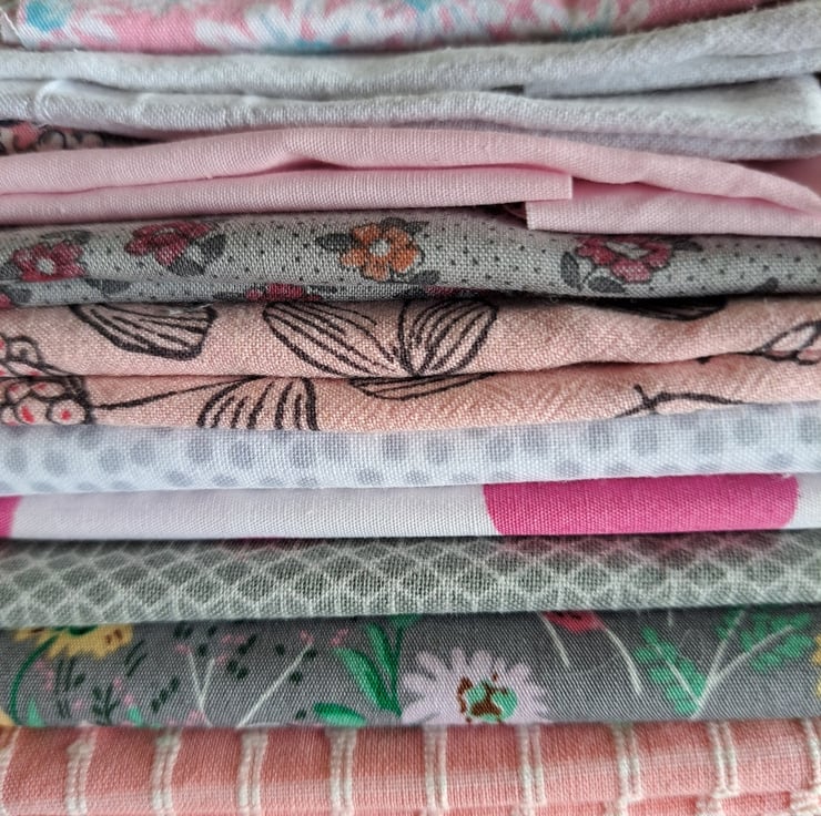 My ex-sister-in-law was mad for pink and grey in the 80s. Bedroom, living room, outfits... you name it. Enough time has passed for pink and grey to be welcomed back into our lives, I think. This generous bundle of 13 good-sized cotton pieces is a subtle and pretty take on the pink and grey theme, with spots, flowers and checks on a variety of new, vintage and rescued fabrics. Includes two brand new fat quarters.