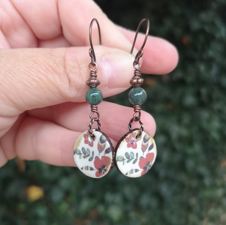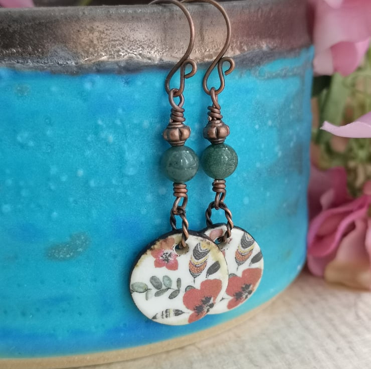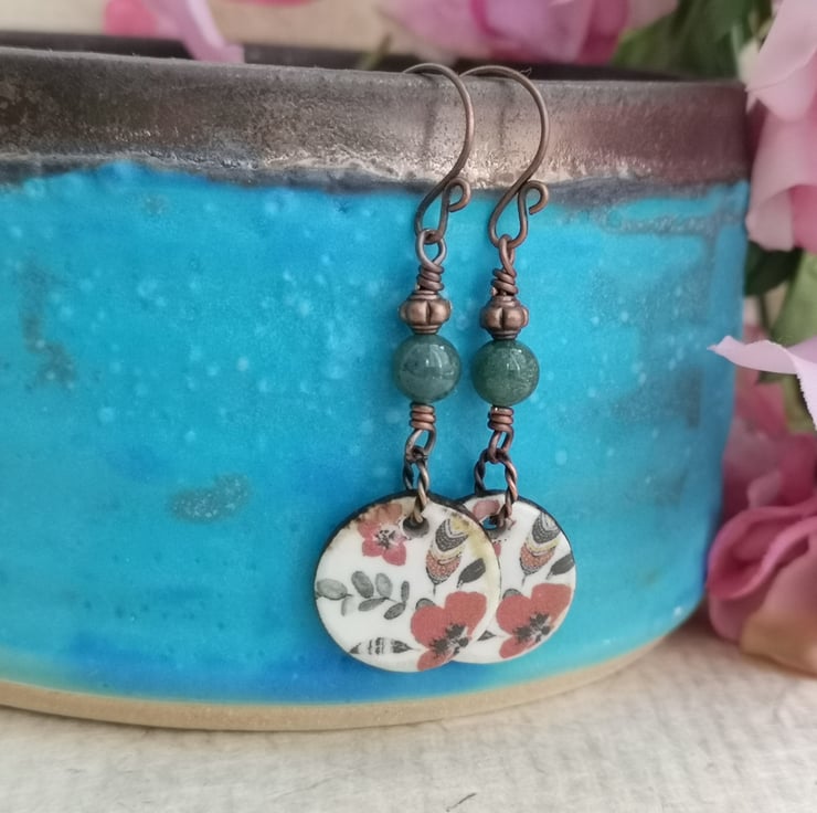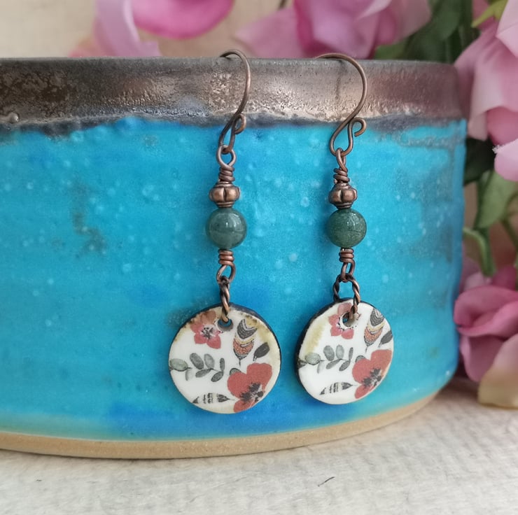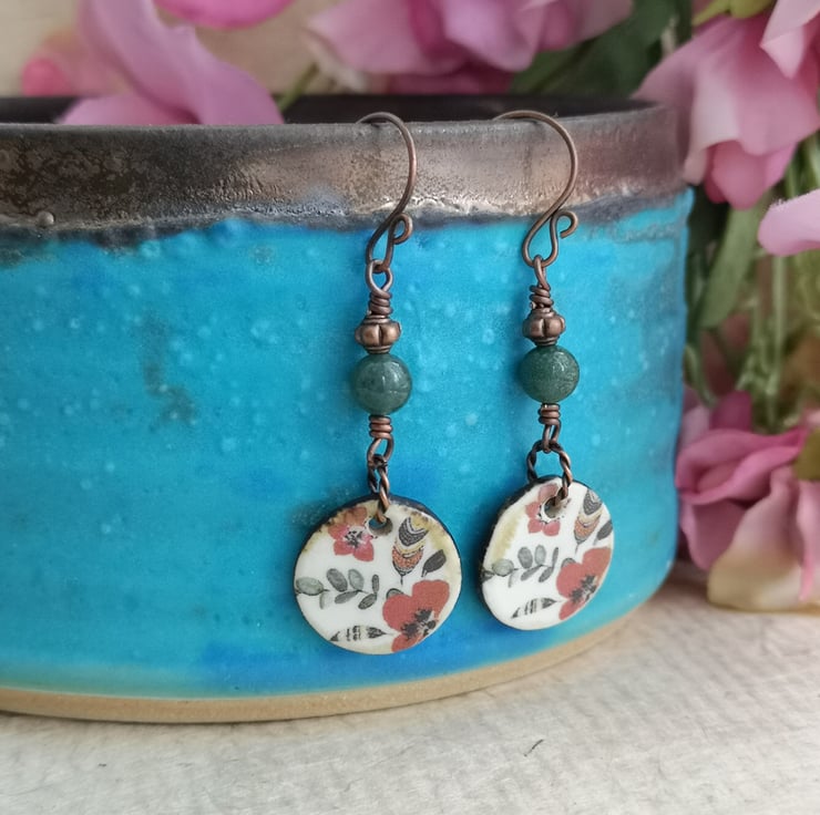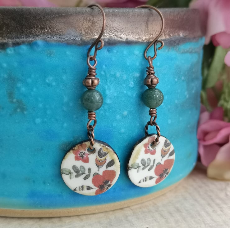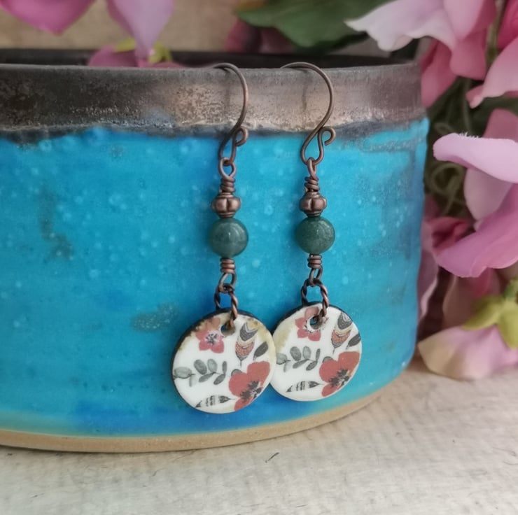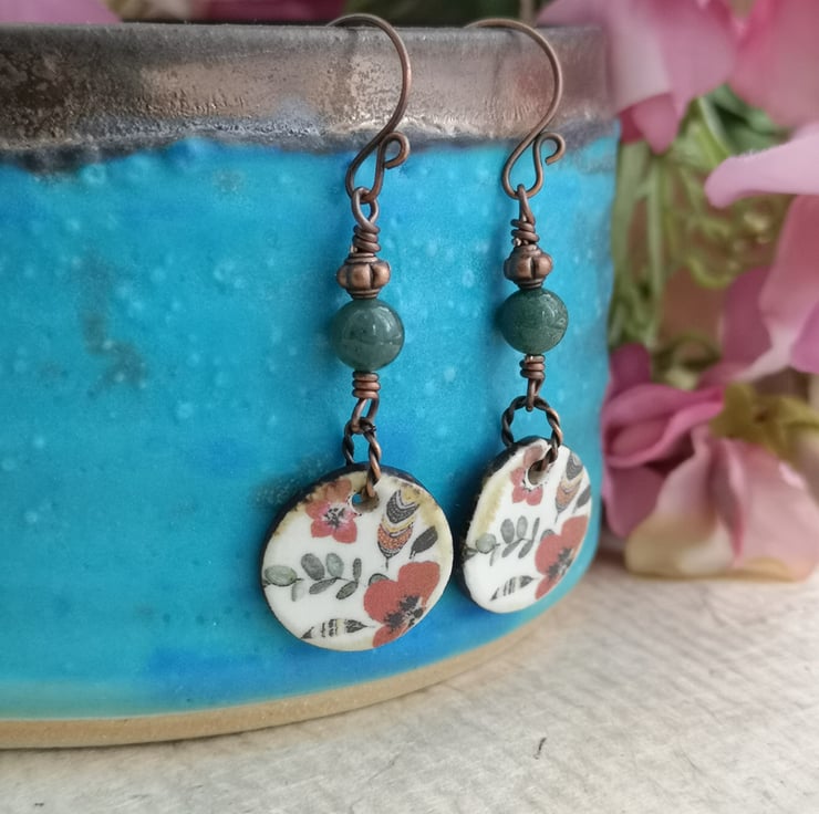 These earrings feature beautiful ceramic charms that have been decorated with a pretty pattern of poppies and leaves. A twisted copper jump ring attaches them to a mossy green jasper bead and a small copper spacer. Copper earwires complete them.