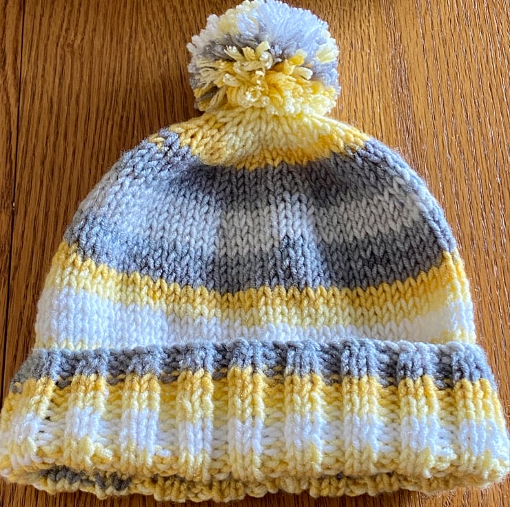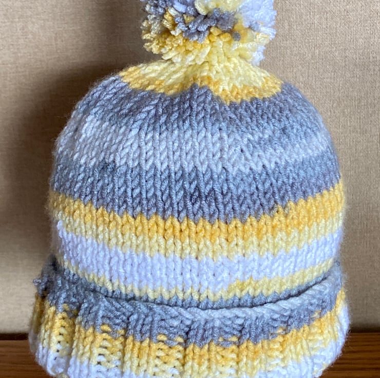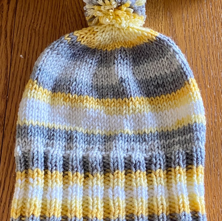 This is a ladies beanie type hat with pom-pom. It is knitted in quality chunky acrylic wool. It s machine washable. I include free gift Christmas wrapping. It is posted via Royal Mail 2nd class small parcel post.