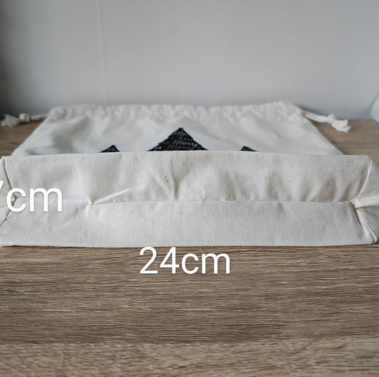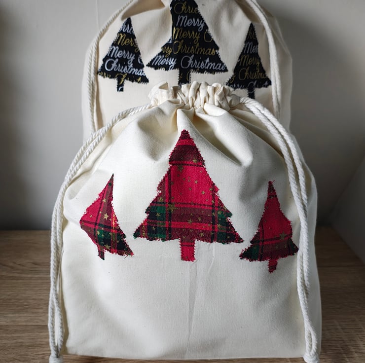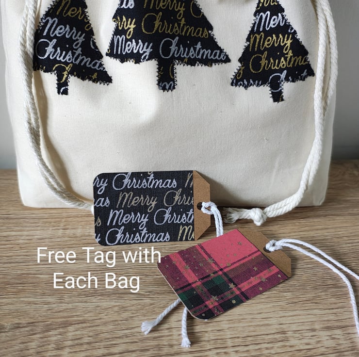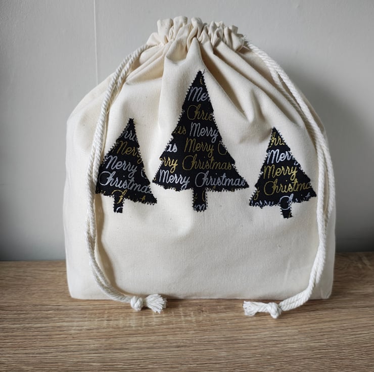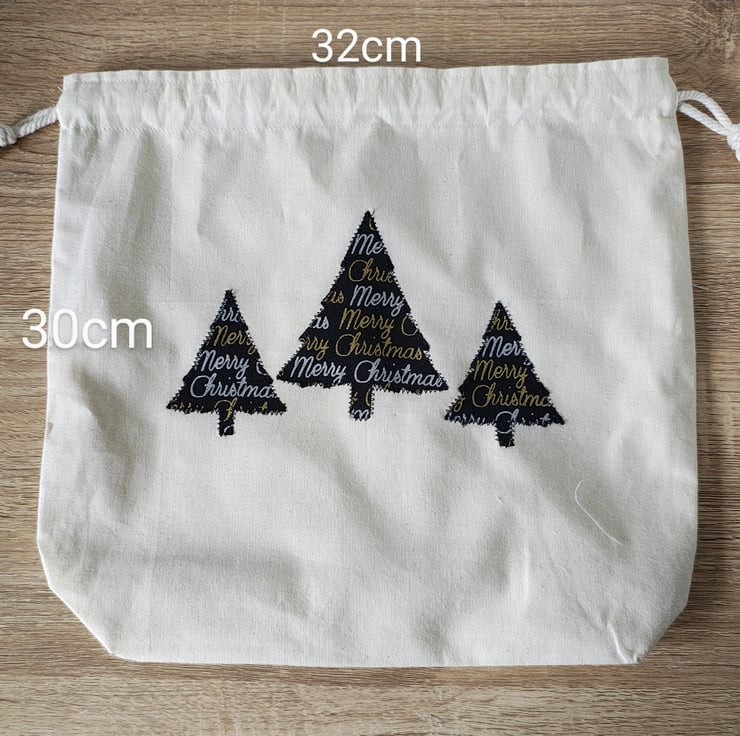 Christmas Tree Applique Gift Bags, set of three black trees with gold and silver Merry Christmas on them. On a cream bag made of calico, with a cream lining. Cotton drawstring closure.