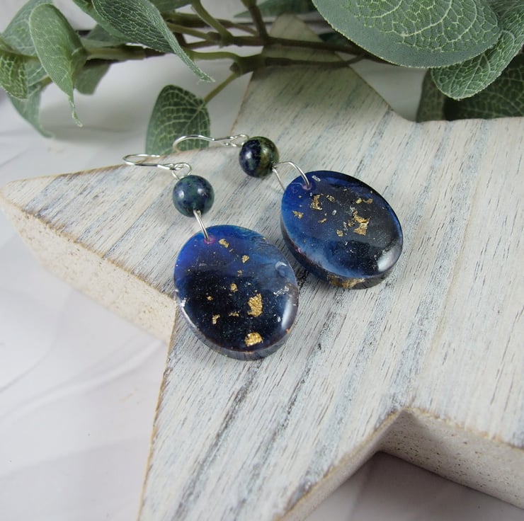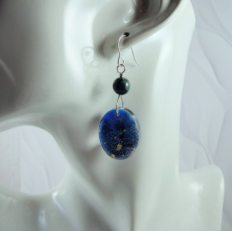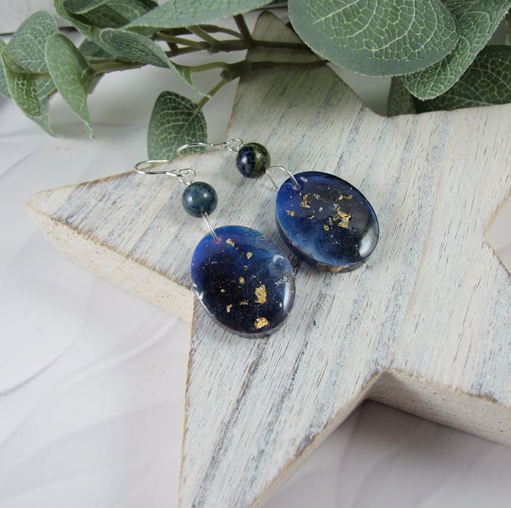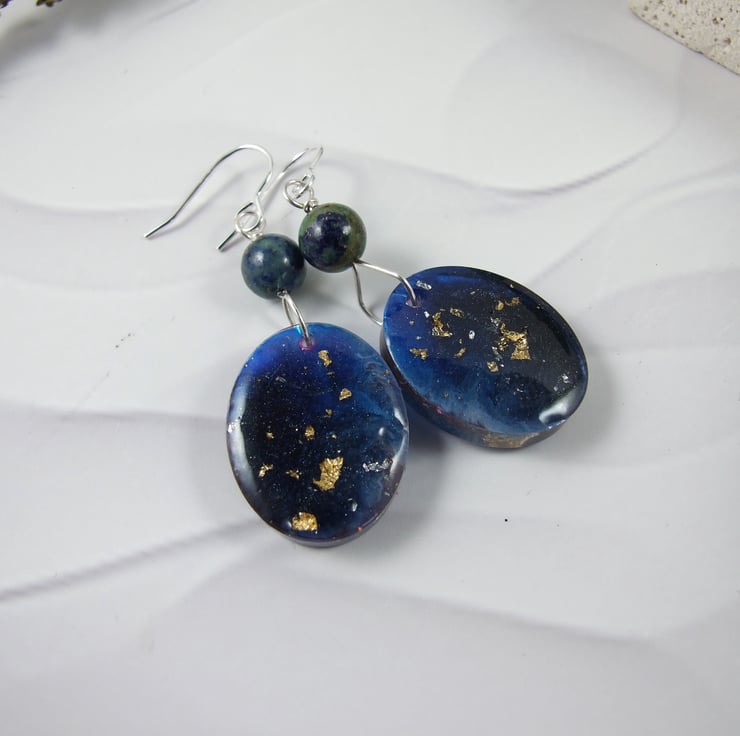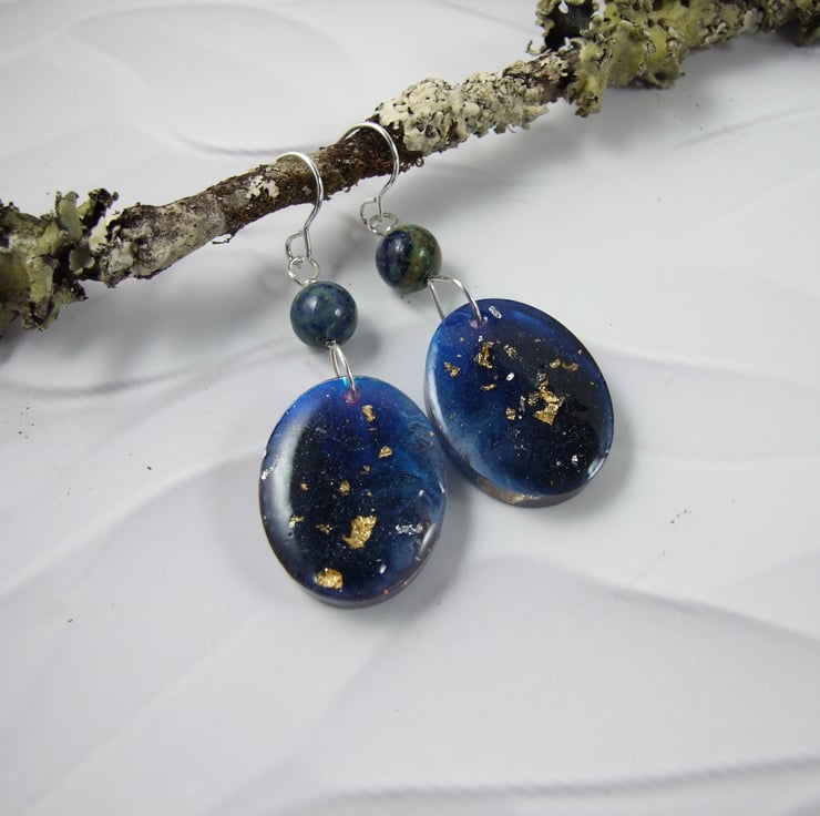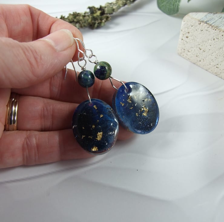 Earrings, Sterling Silver and Navy Blue Resin Art Droppers. One of a kind bio resin art dropper earrings in shades of dark blue with metal leaf. Paired with chrysocholla gemstone beads and sterling silver fittings and ear wire.