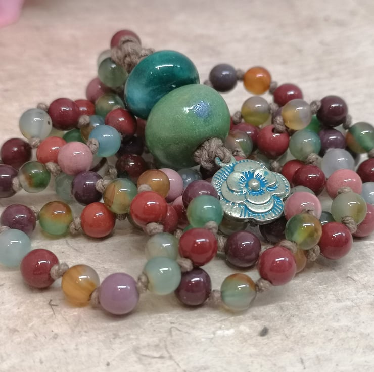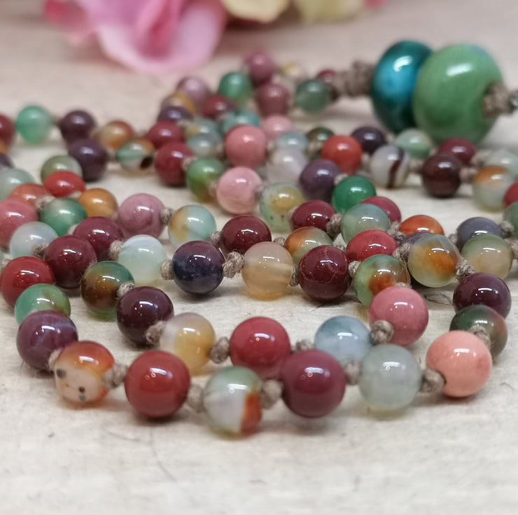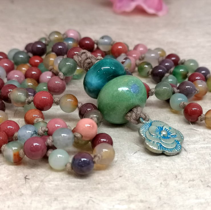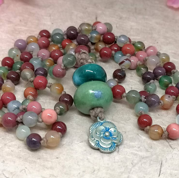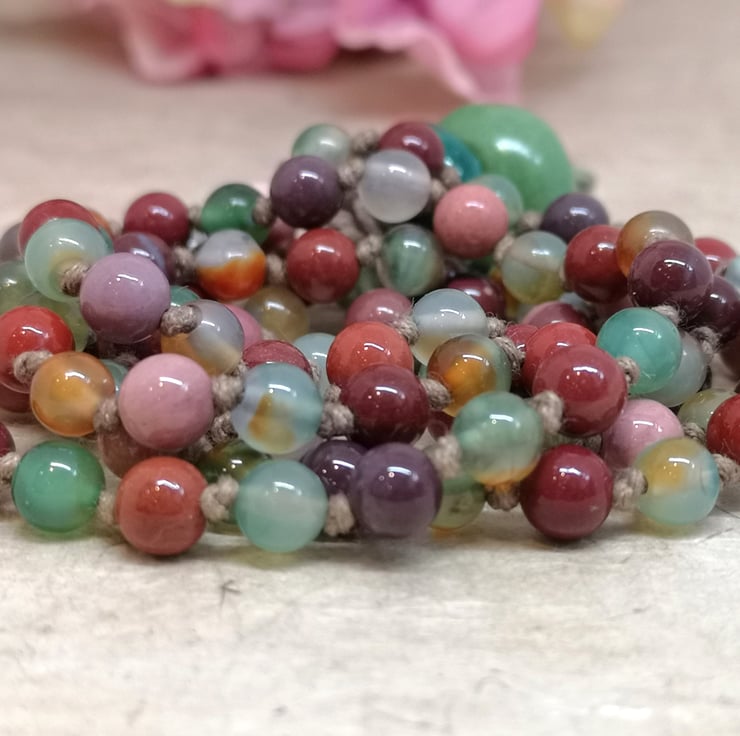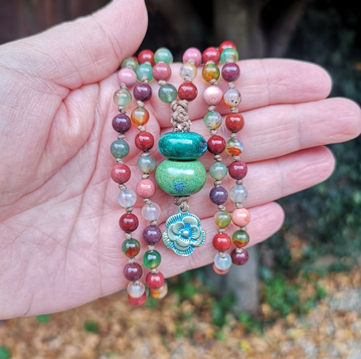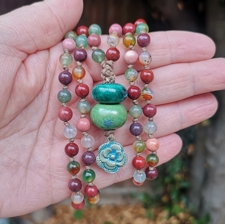 This handcrafted mala necklace features 108 carefully selected agate and jasper beads. It has an autumn-inspired colour palette of rich greens, earthy russets and soft pinky-purples. Each bead is hand-knotted onto durable cotton cord ensuring both strength and flexibility for meditation or everyday wear.