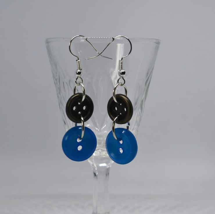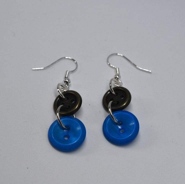 A pair of earrings made using vintage buttons and silver plated jump rings. The acrylic buttons are blue and antique silver in colour and they have a drop of approx. 3cm from the base of the ear wires. The ear wires are silver plated, but options for sterling silver and rhodium plated are available at checkout.