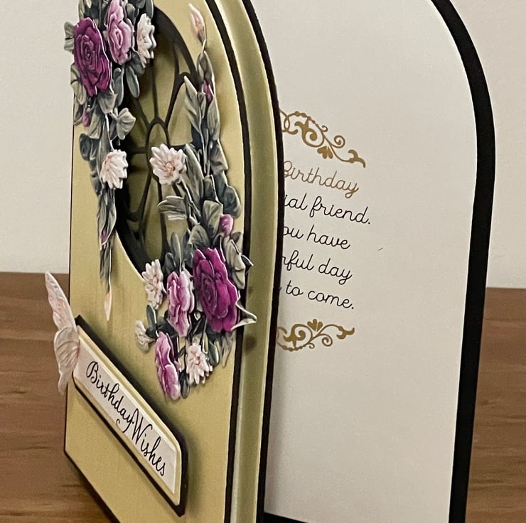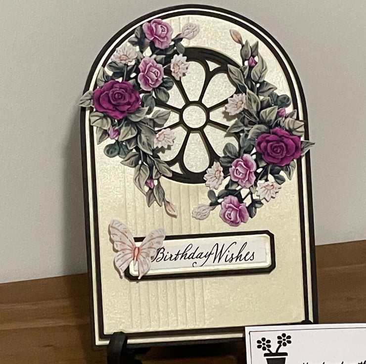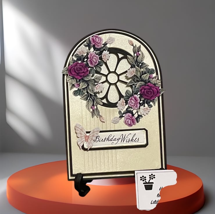 A beautiful handmade 3D Decoupage Happy Birthday card. The card design is harnessing the beauty of light with an intricate cut-out window, along with a floral flourish and a beautiful butterfly