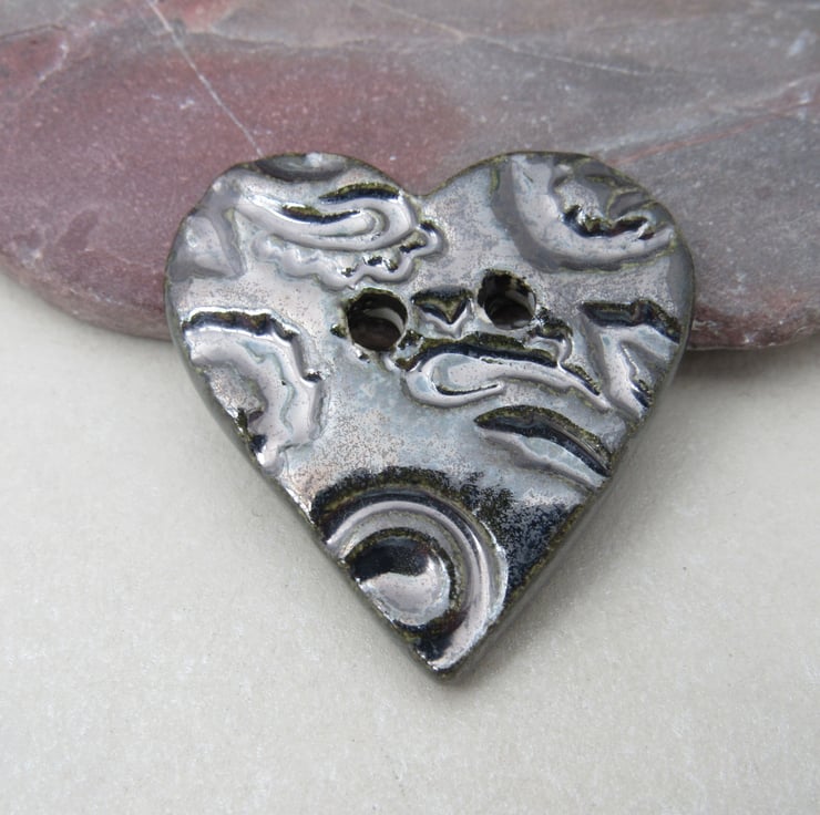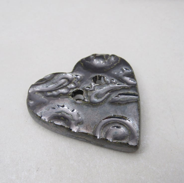 Medium heart shaped stoneware button, textured with a bold leaf and flower motif.