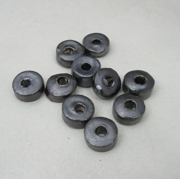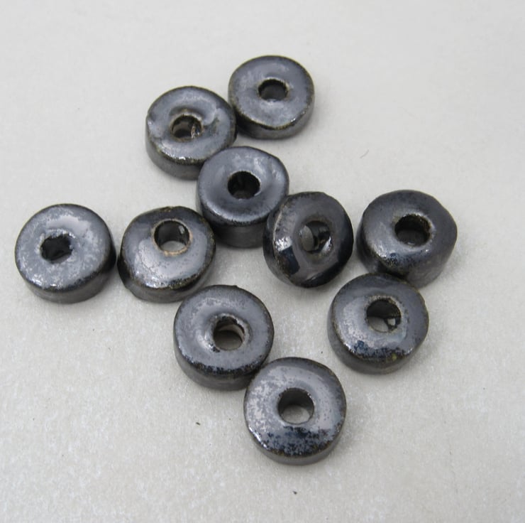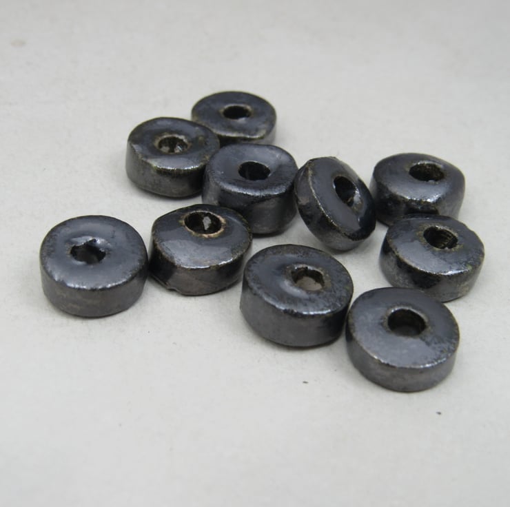 They are approx 1.3 cms (0.5") diameter, with a 3mm (0.1") hole but as they are handmade, they are not identical and not perfectly round.