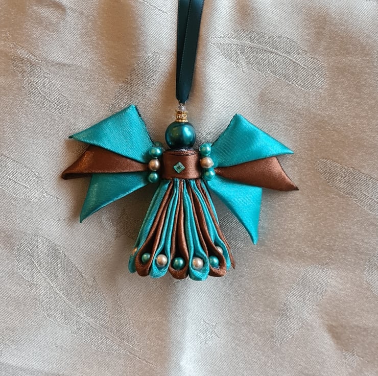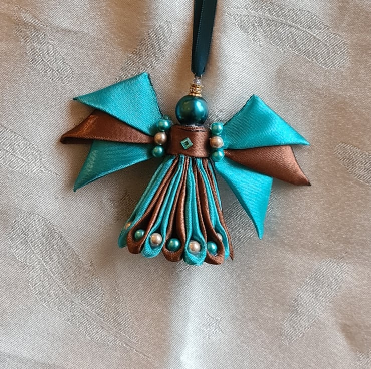 Please note this is NOT A TOY. Keep away from babies, young children and pets due to small parts. If any part is ingested seek medical treatment/advice immediately. Misuse can cause breakage. Keep away from naked flames/candles/cigarettes etc as these can melt/burn/damage your Ribbon Angel. Ribbon Angels contain a central wire in their core, do not bend wire or Angel as this can weaken/break wire/damage Angel figure. As with all handmade items there may be some small imperfections (such as glue drips/heat spots, colour variations and slight styling variations). Misuse may cause breakage. These items are for ornamental use only. Materials. Turquoise Ribbon. Brown Ribbon. Turquoise glass pearl beads. Light Brown glass pearl beads. Turquoise acrylic gems. Bead caps. Floral Wire. Dark Turquoise ribbon. Hot Glue. Double sided tape.