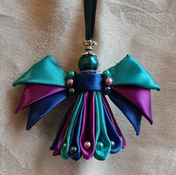 Angel is made from Turquoise, Purple and Royal Blue ribbon, Glass Pearl beads, wire, bead caps and glue. It has a Dark Turquoise ribbon so it can be hung on a tree. Angel is Approx 9cm high, has a hanging length of approx 16cm with the ribbon. Approx 11cm wide.