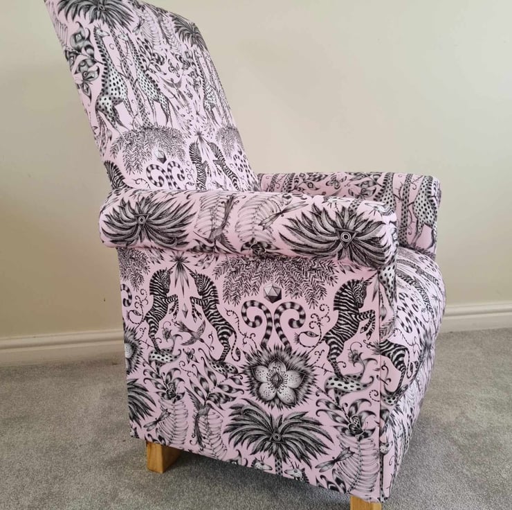 I am offering for sale this gorgeous ADULT'S chair, which has been made myself. I am a professional upholsterer with over 33 year’s experience, and have made this sturdy little chair using Emma Shipley Kruger Pink sateen fabric..