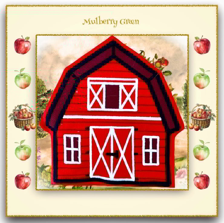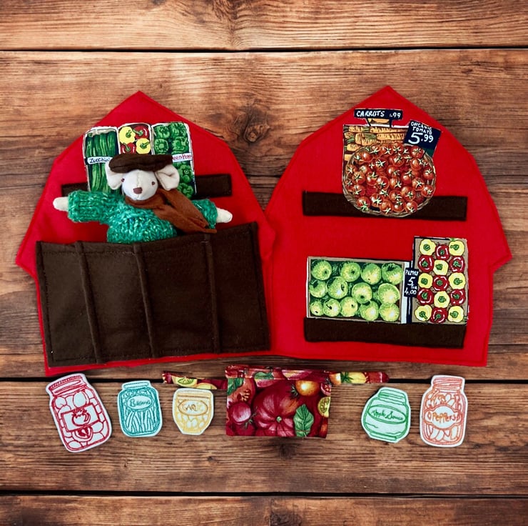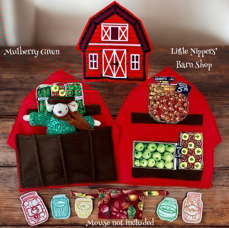 The Barn Shop - a Little Nipper farm shop from the maze of little burrows and passages underneath the barn at Mulberry Farm. The barn shop is embroidered onto felt and inside has little shelves, appliquéd with fruit and vegetables and a little counter pocket - a store for little embroidered jars of canned fruit and veg and a tiny mouse apron in a tomato print. When the jars are removed for play, a little mouse can be slipped behind the counter to serve the other Little Nippers with supplies.