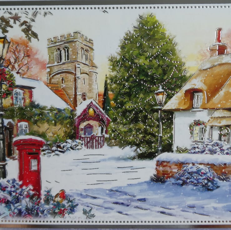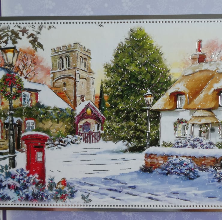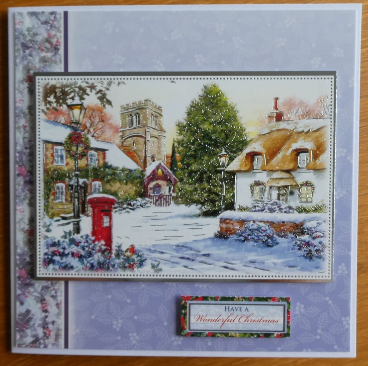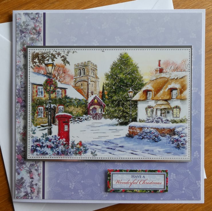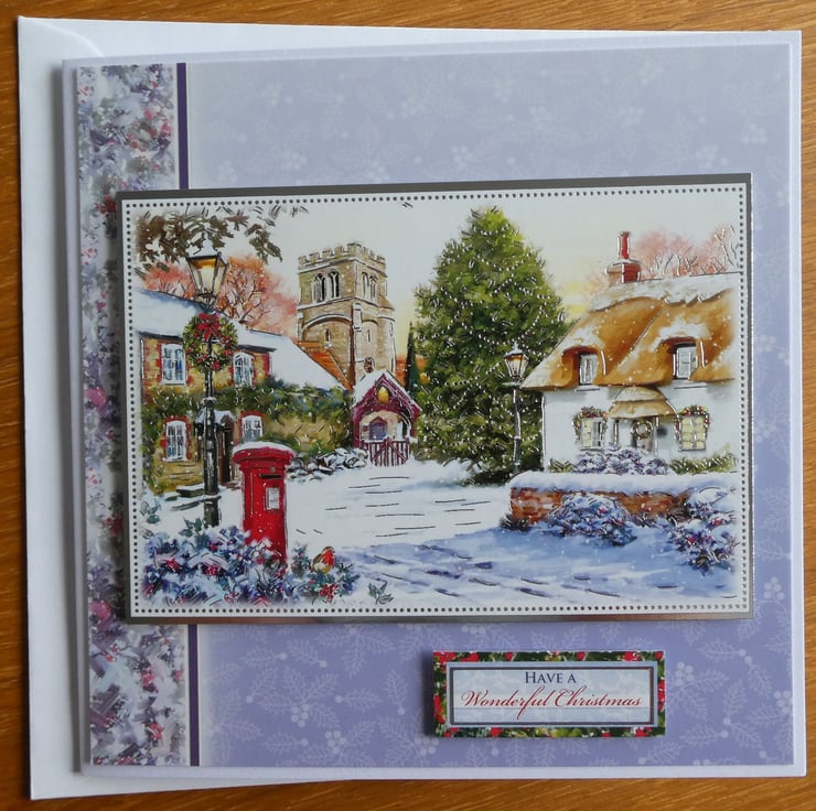 A rectangular card topper with the image of a snowy Christmas village scene, complete with a church, post box, street lamp, Christmas tree and idyllic country cottage.