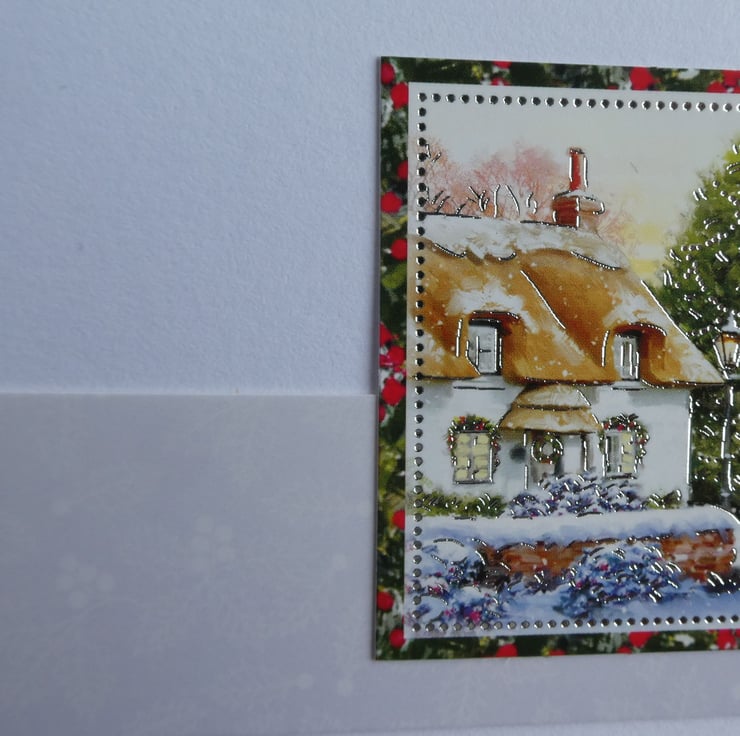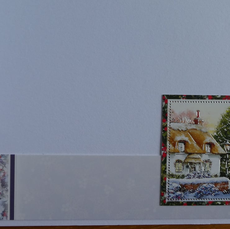 Inside the card is a strip of matching card across the bottom and a small image of a cottage and Christmas tree,