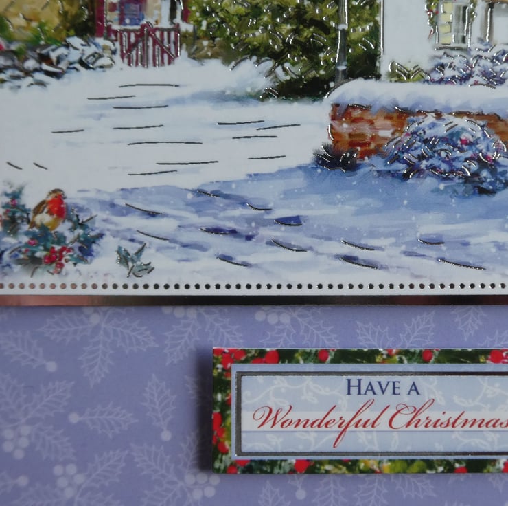 The topper has a border and details highlighted with silver foil and has been raised on foam pads to add dimension. To complete the design a messge with the words Have A Wonderful Christmas has been added, also raised on foam pads.