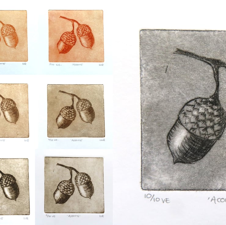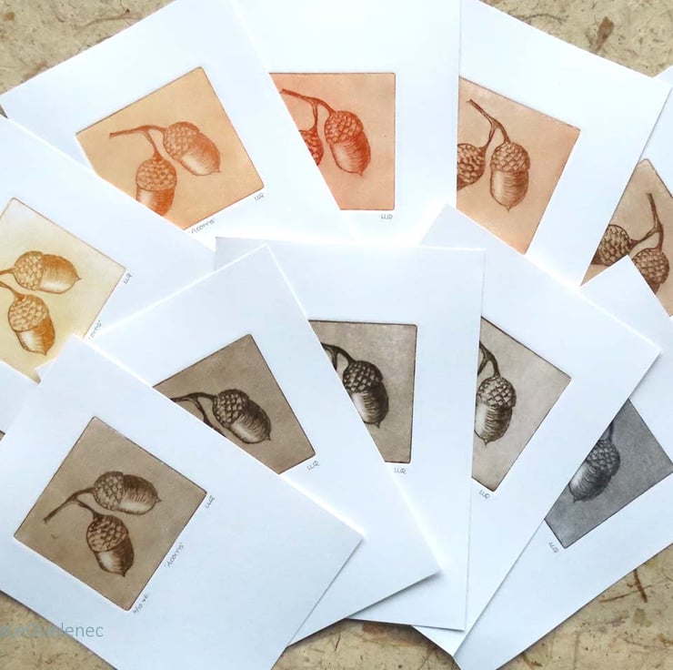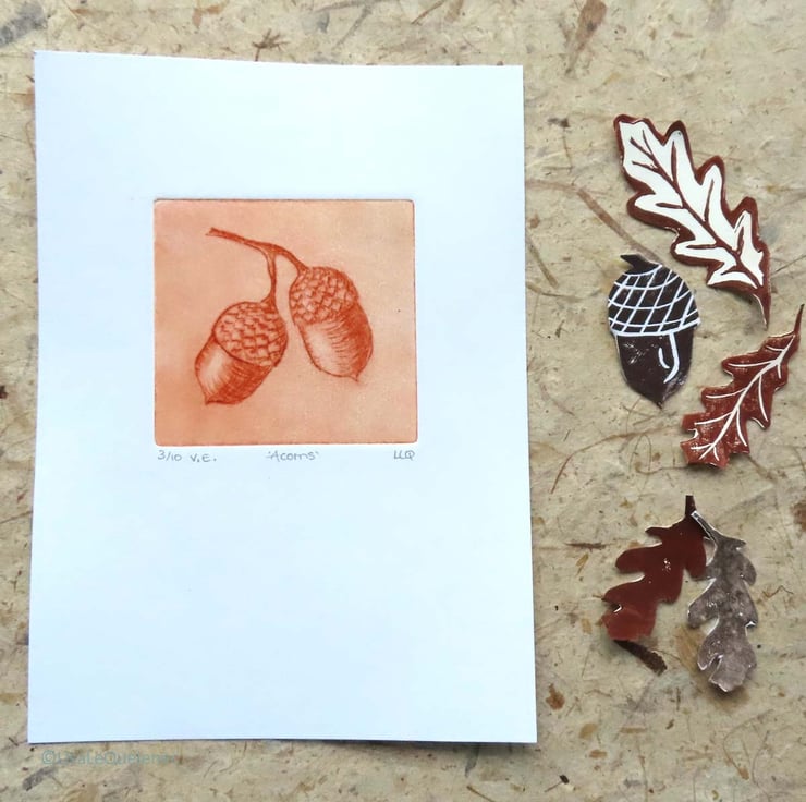 Acorns that found their way into my pocket whilst out walking my dog. This is print no. 3 in an edition of 10 with each printed in a different autumnal shade.