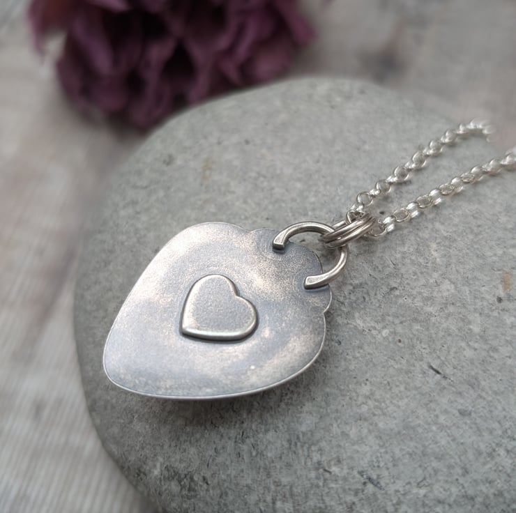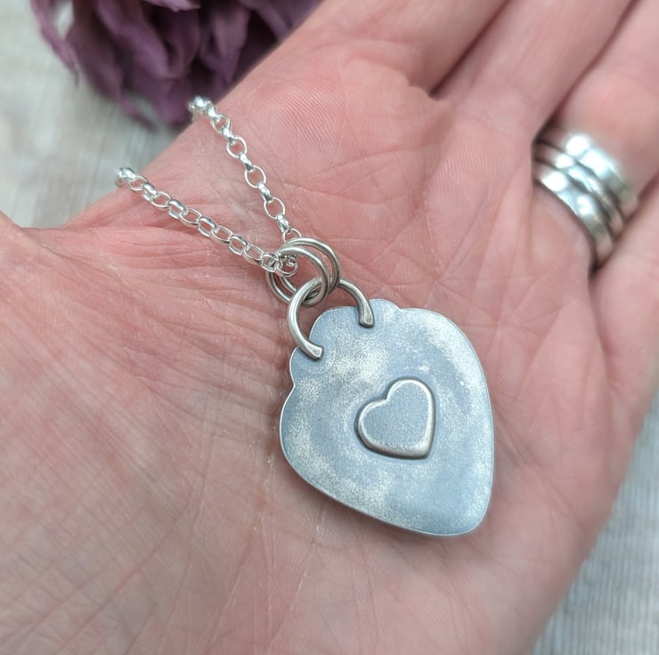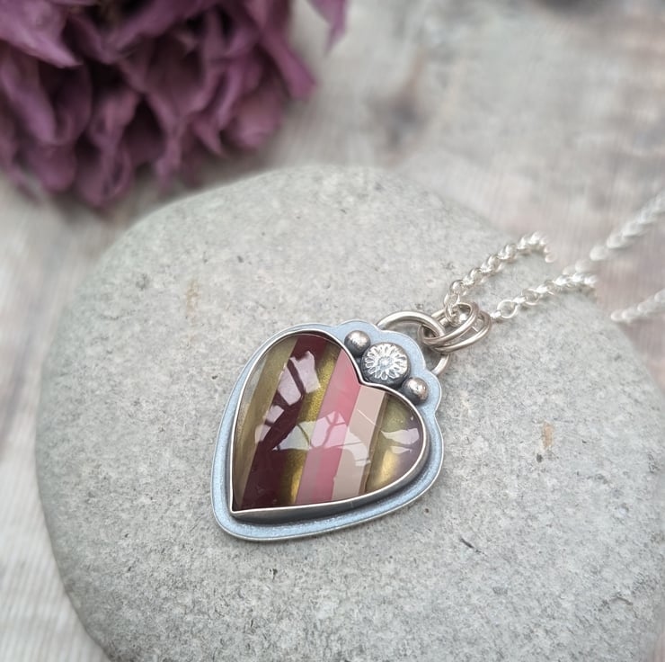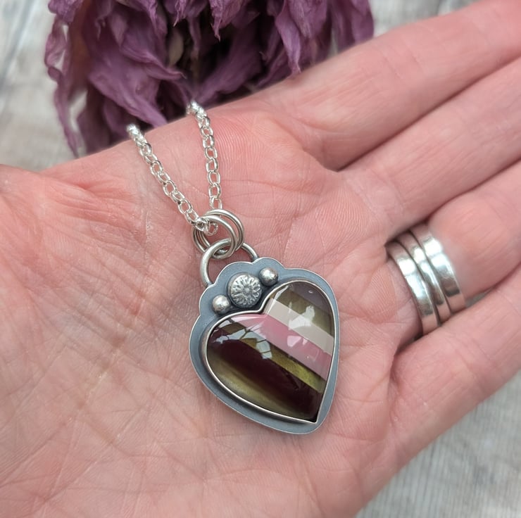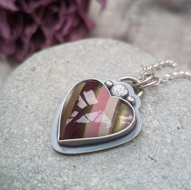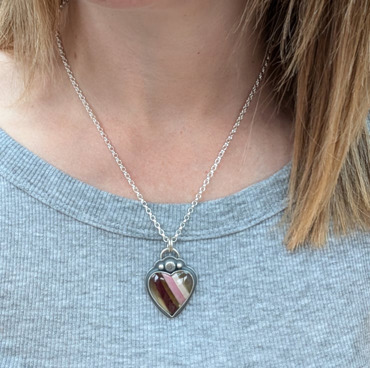 Handmade with love and care, this one-of-a-kind statement heart necklace features a stunning piece of Surfite set in a handmade recycled silver setting. The vibrant colors of the Surfite are perfectly framed by the silver, making it a truly unique piece. The necklace hangs on an 18-inch chain, offering the perfect length for everyday wear. On the back, a hidden heart detail adds a sweet touch, symbolizing the thoughtfulness that goes into each creation.