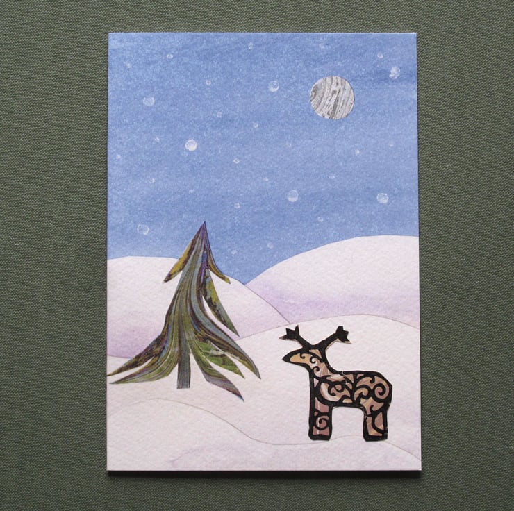 Unique handmade card. Each card has an original printed paper reindeer, mounted on a background originally made from cut papers. Some are elevated and some fixed flat on the card. Please check image. A6 card, with side fold. Blank inside.