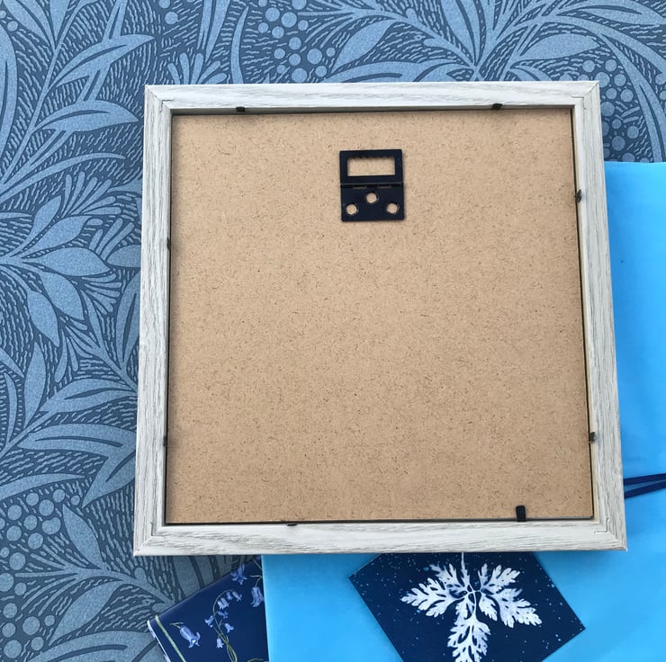The frame measures 23 x 23 x 2cm, and is fitted with a hinged rear bracket, ready to hang, but would look equally good sitting on picture shelves, the mount is a soft pale cream colour and the aperture sizes are 12 x 12cm.