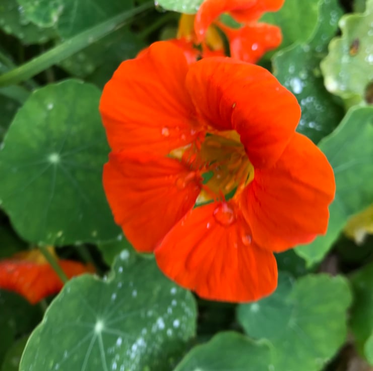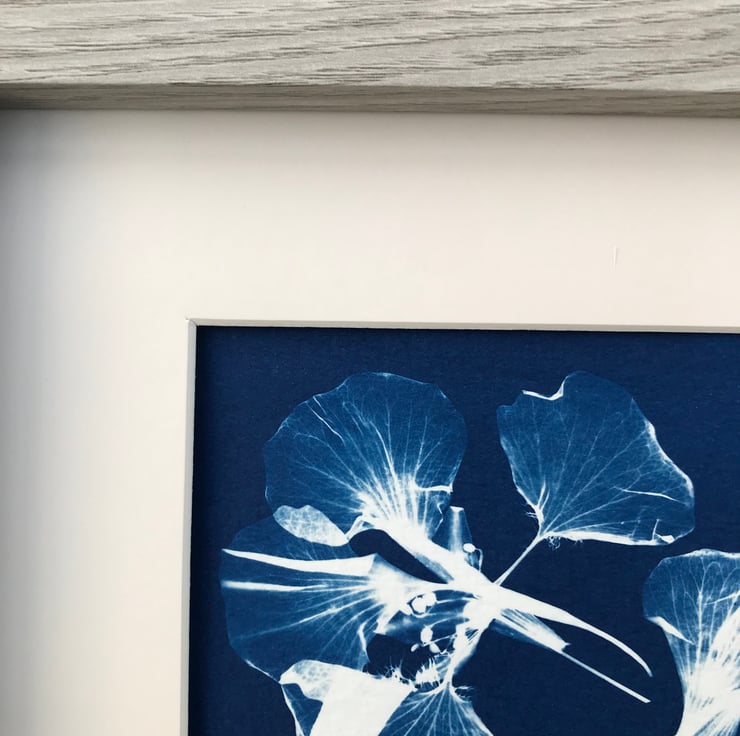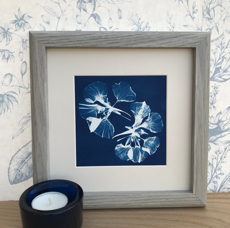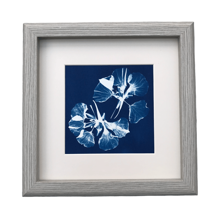 Botanical Art in Contemporary Grey Frame. A delightful original artwork of Nasturtium Flowers. Self-seeding and full of energy this garden annual can make its way up and over anything in its path, rockeries, shrubs and fences. The Nasturtium's fine petals have let some light through in the Cyanotype process, showing the beauty of the veins. This would be a lovely gift for a Gardener, and add some botanical charm to a family room or workspace.