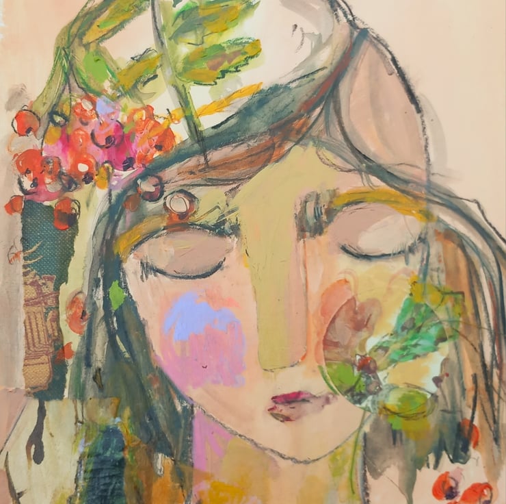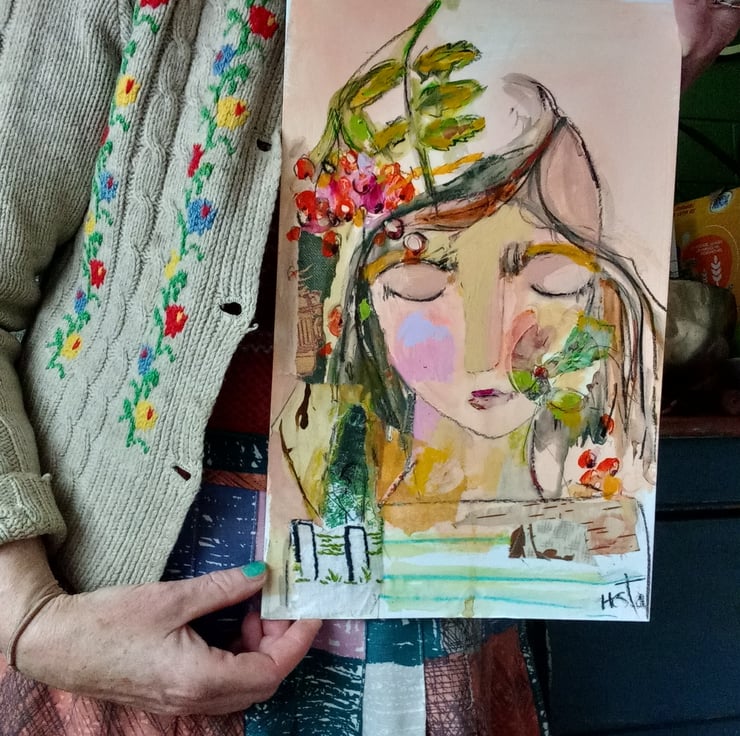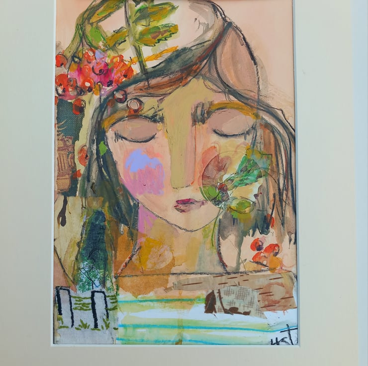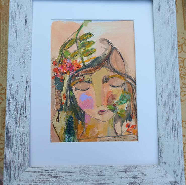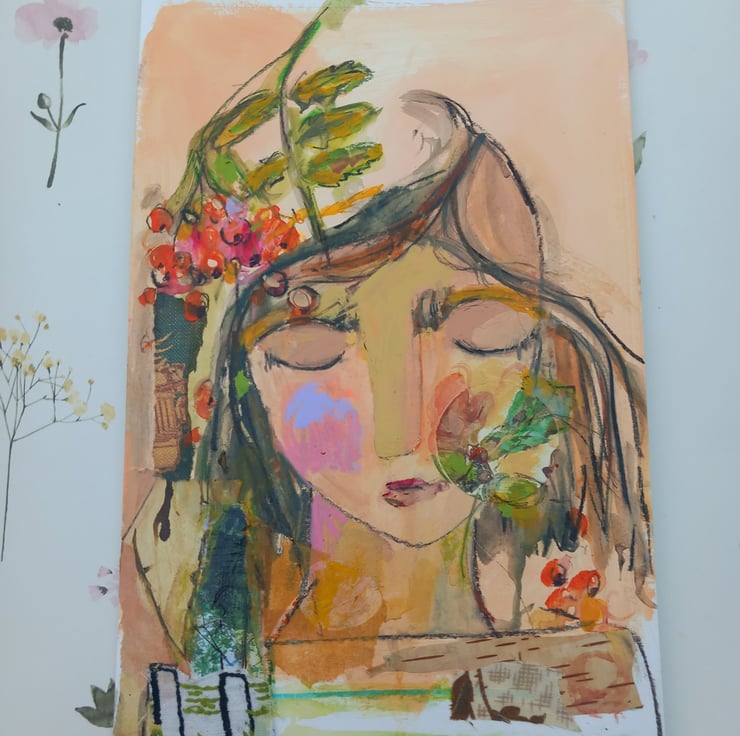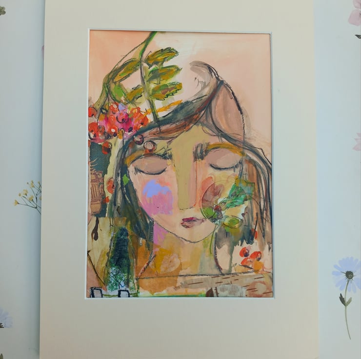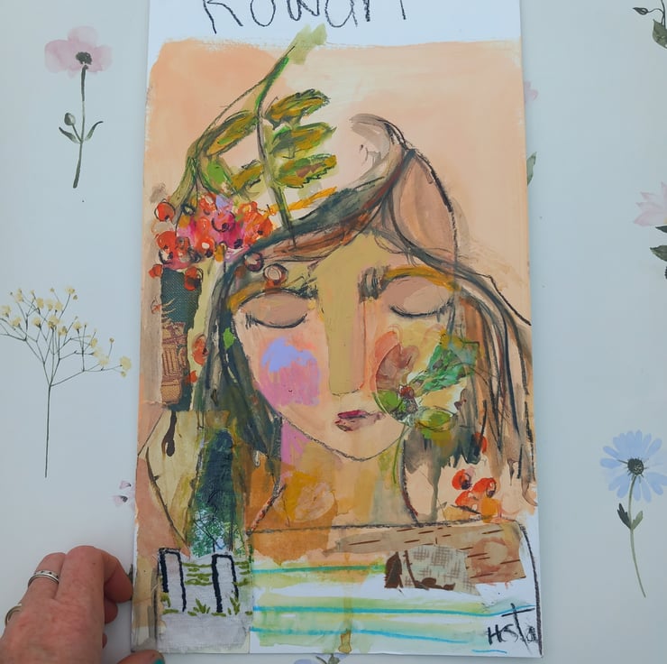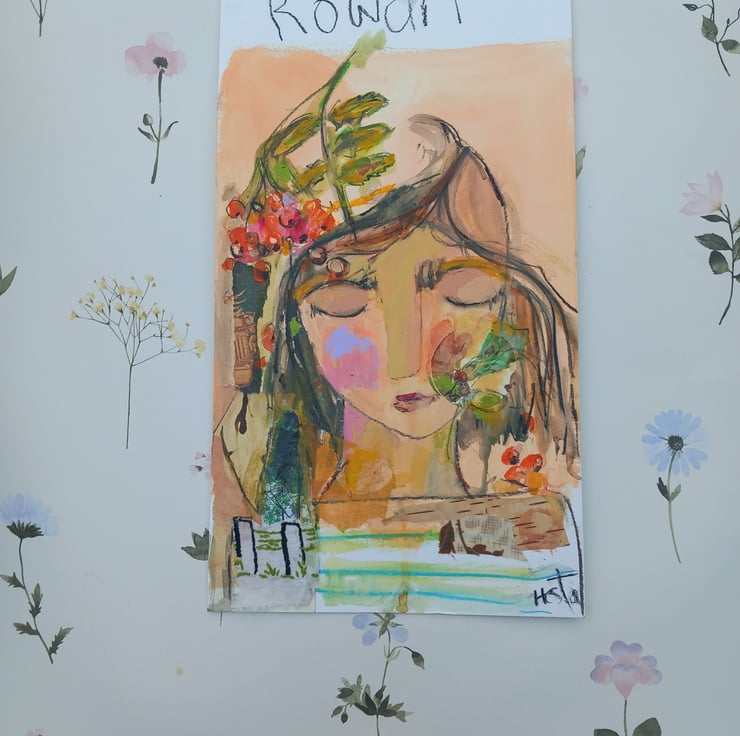 She loves the autumn as soon as the rowan berrys turn. I use a plant reed dipped in ink for the outline then add paint in a loose confidentt syle. Each one is so different. This one has added collage. light varnished