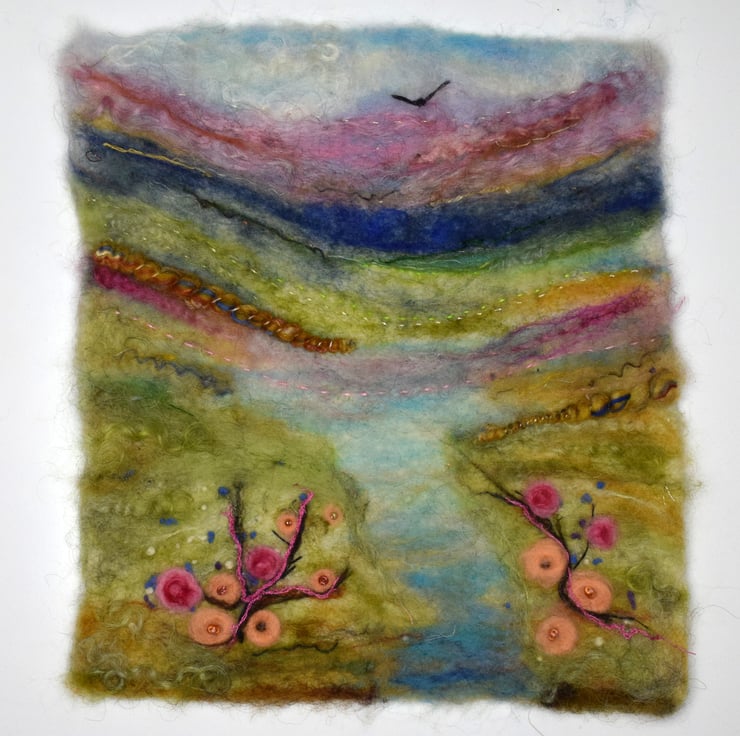 A blackbird is flying free against the pink sunset above the purple mountains. Layers of colourful needle felting and slow stitching depict a wonderful scenic background leading the eye into a meandering mountain stream in the foreground.
