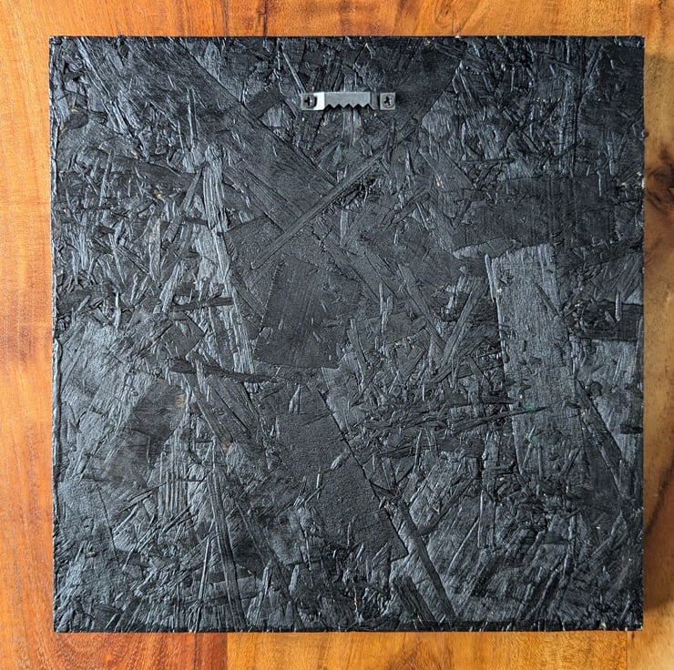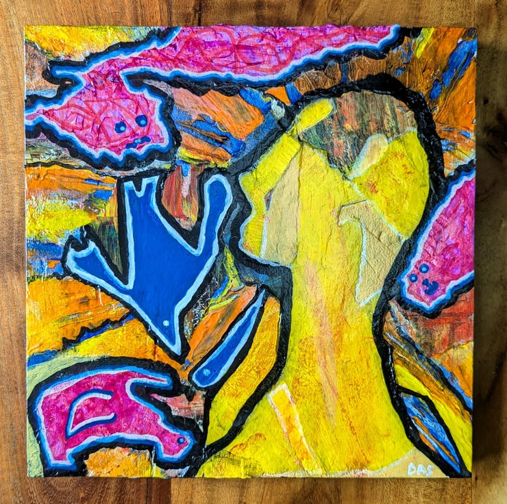 An original mixed media collage and painting on OSB board. Item is signed 'DAS' by the artist and has a lacquered finish. Item measures 25 cm by 25 cm (9.8 by 9.8 inches). Item depth is 18mm (0.7 inches). The artwork has a hanger on the rear suitable for a picture hook. The Artwork draws on ideas of deep thought and dreamworlds and is made from torn pieces of painted paper glued and painted by brush and Posca paint pens.