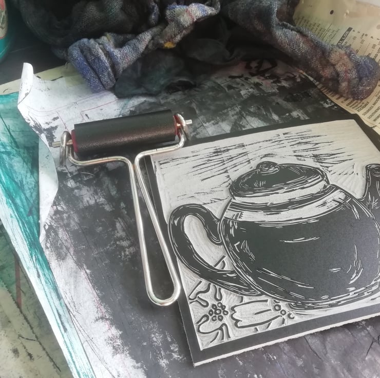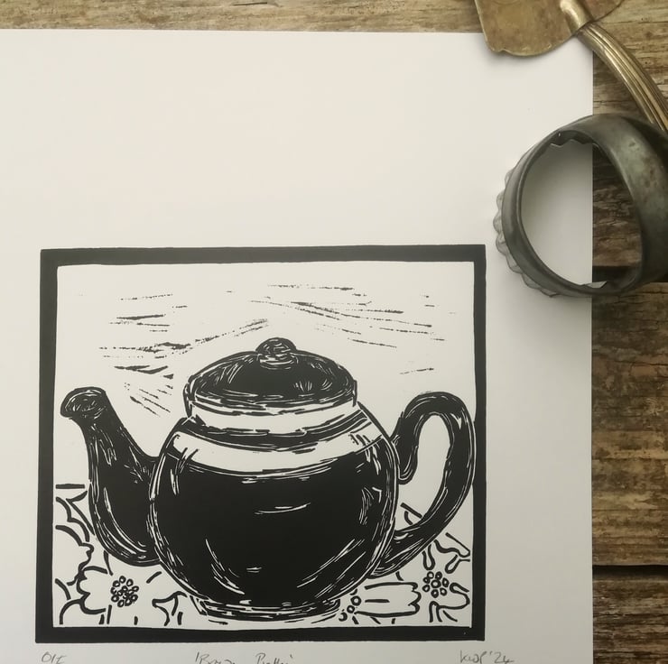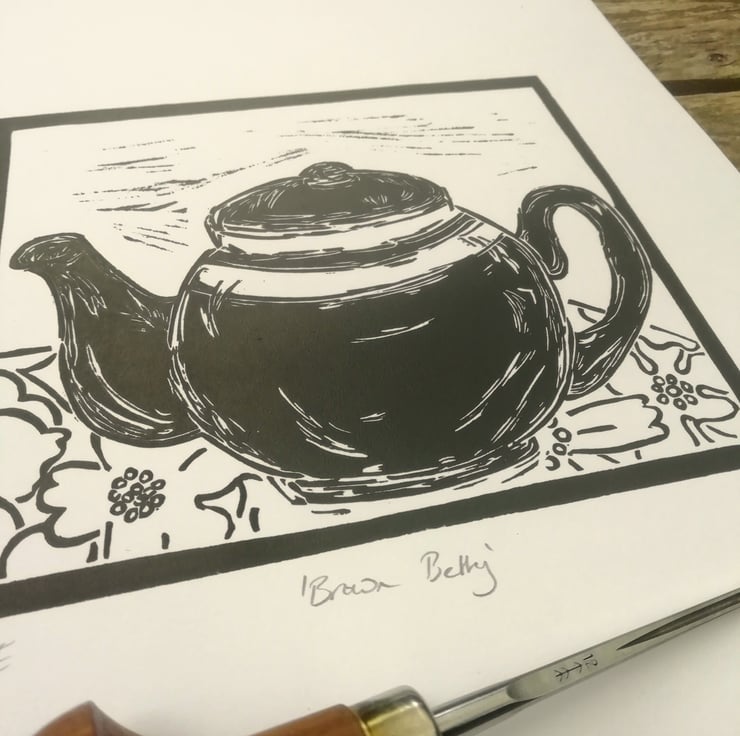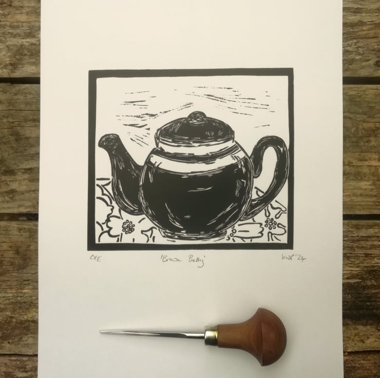 ‘Brown Betty’ Teapot print – Original hand crafted linocut A4 by Kathryn.Prints