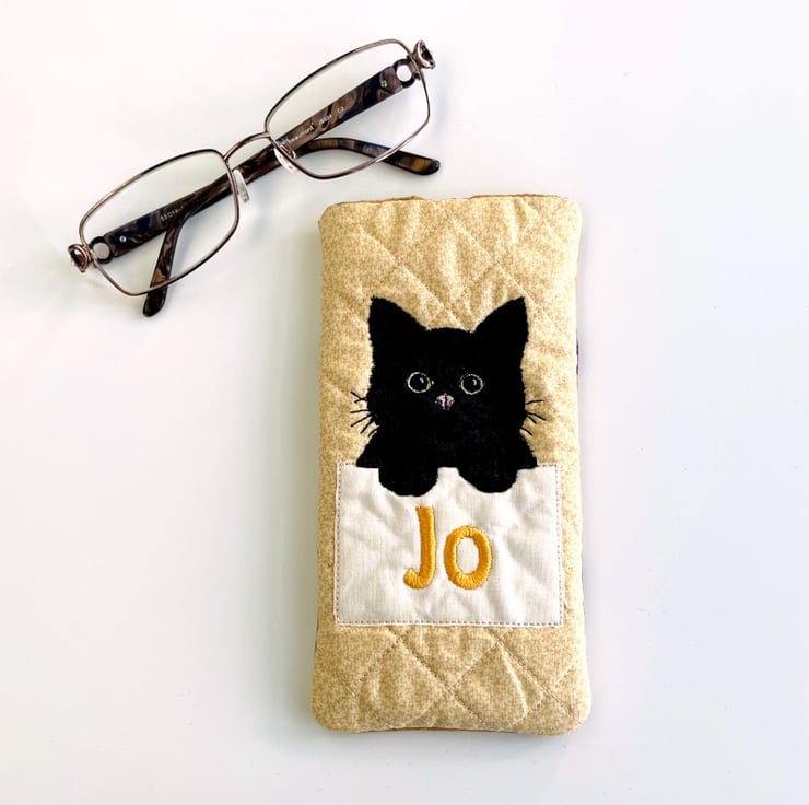 A Super Cute Black Cat Face Padded Glasses Case with elastic loop and button to keep closed.