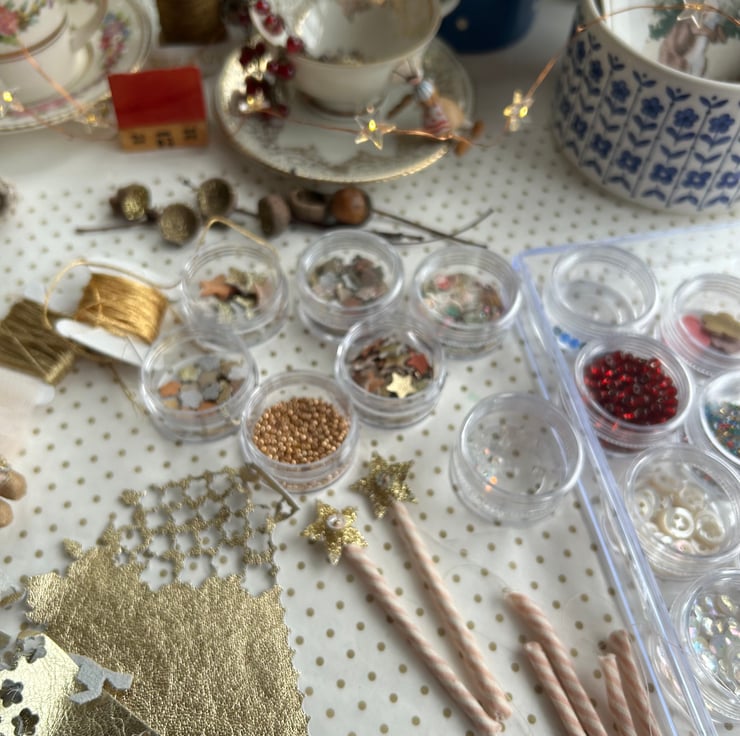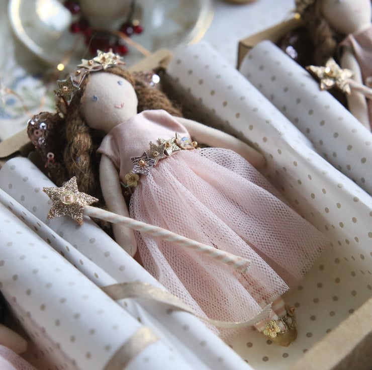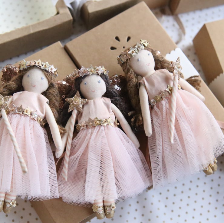 She has sequin wings, a little star wand and gold painted shoes with a tiny flower.