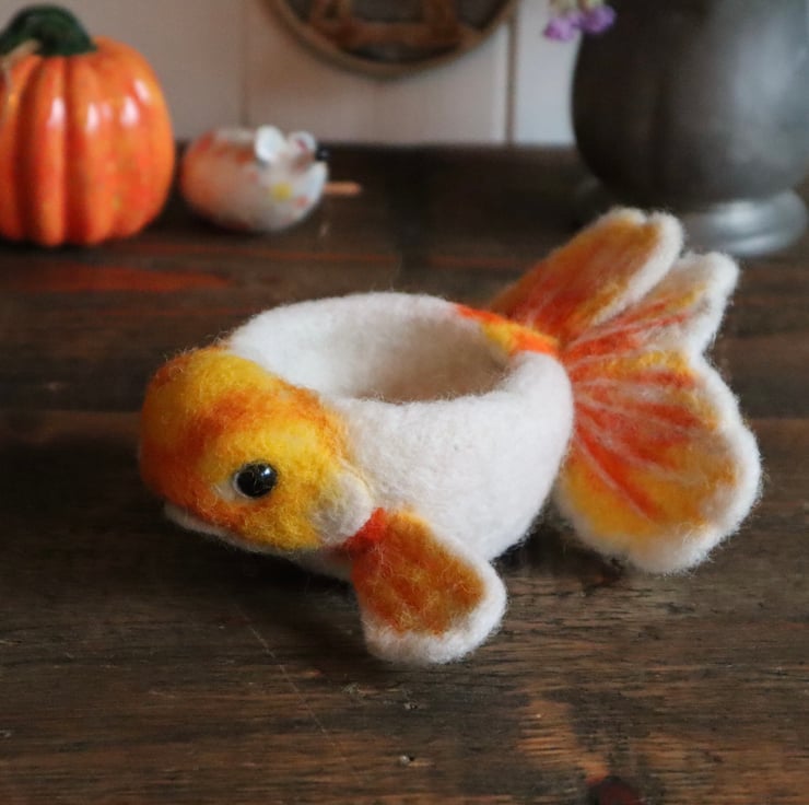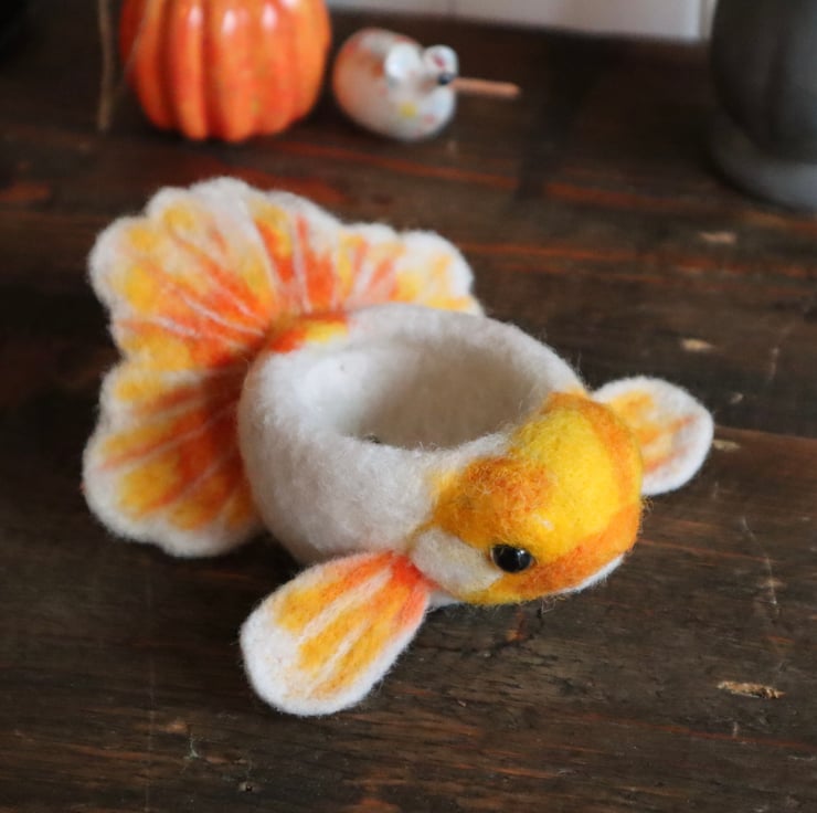 This is a small needle felted trinket dish in the shape of a fancy goldfish, suitable for keeping small items (‘such as rings)in a safe place!