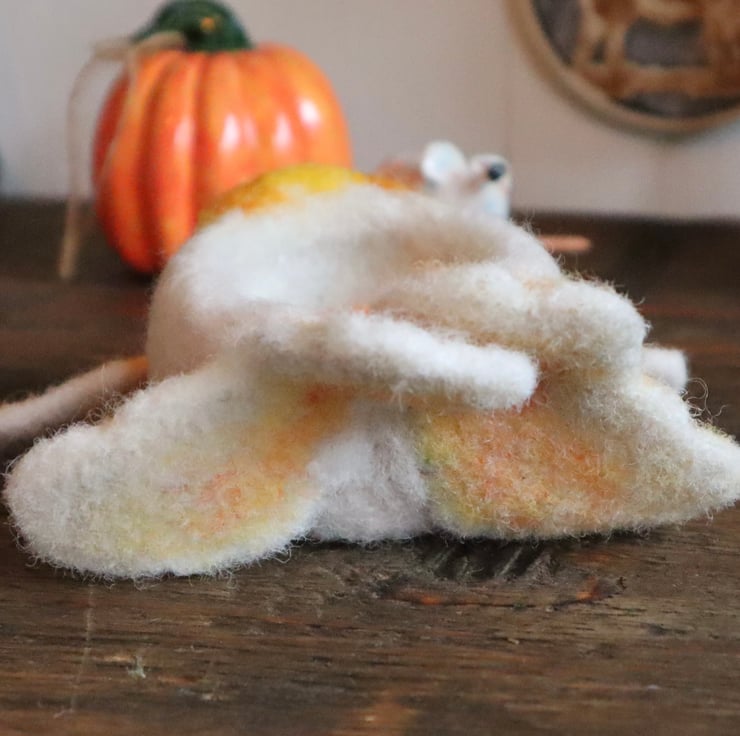 I have created him in natural colour wool which is an off white with some tiny areas of darker wool (‘this is the colour of the sheep it came from’). And the orange and yellow wool on the face, fins and tail has been hand dyed by me, the wool has come from sheep kept locally.