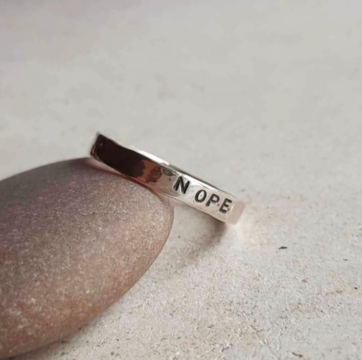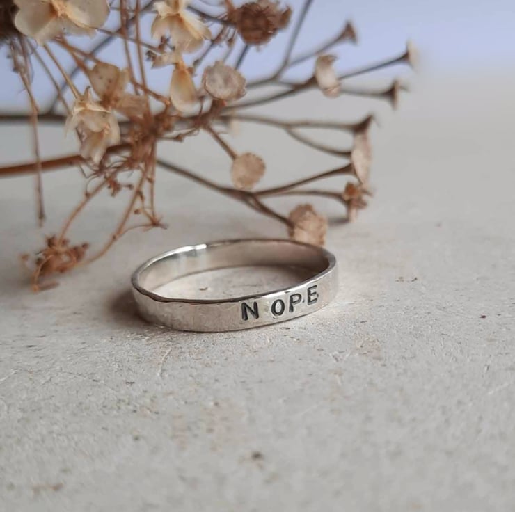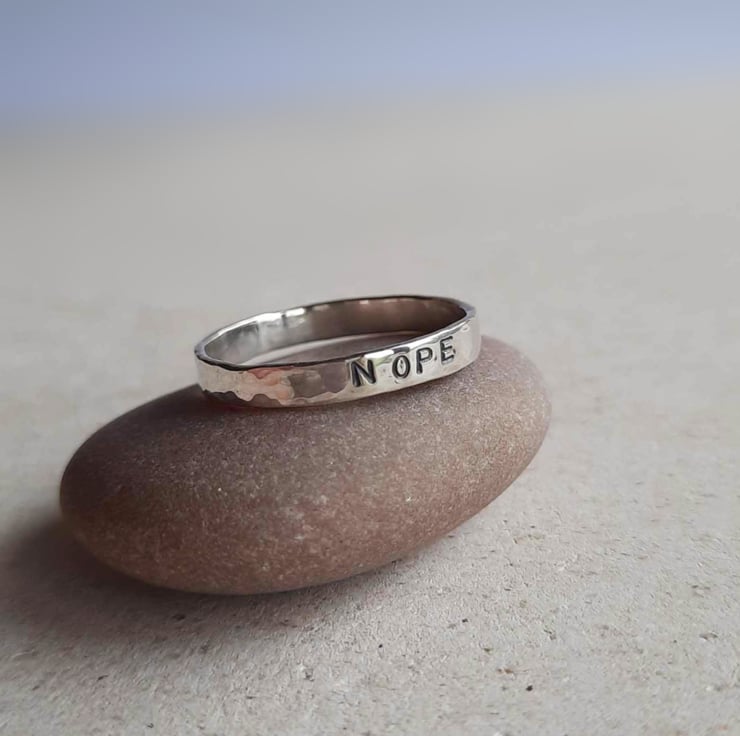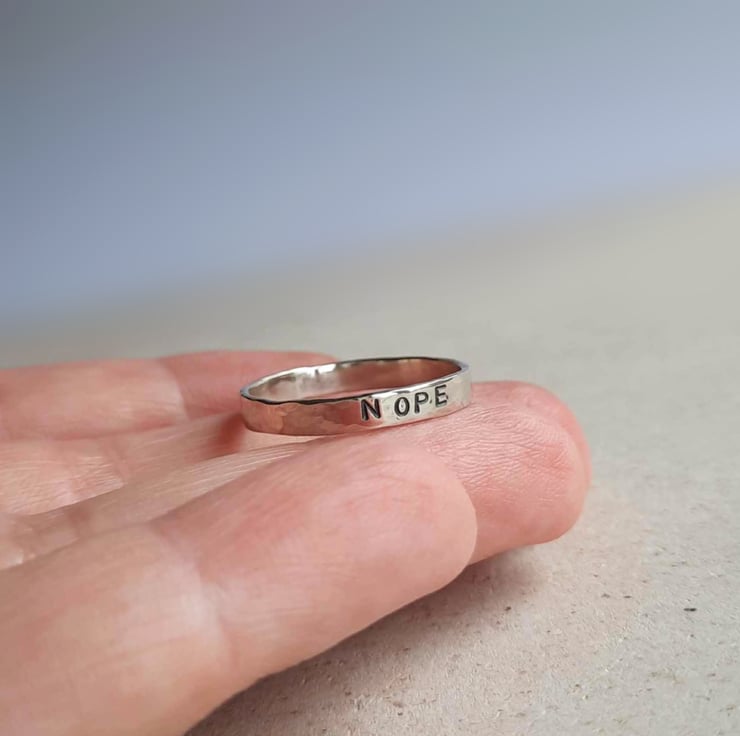 Hand stamped with the word "NOPE", it's perfect for any finger or for your thumb but it really works best when worn on the middle finger...
