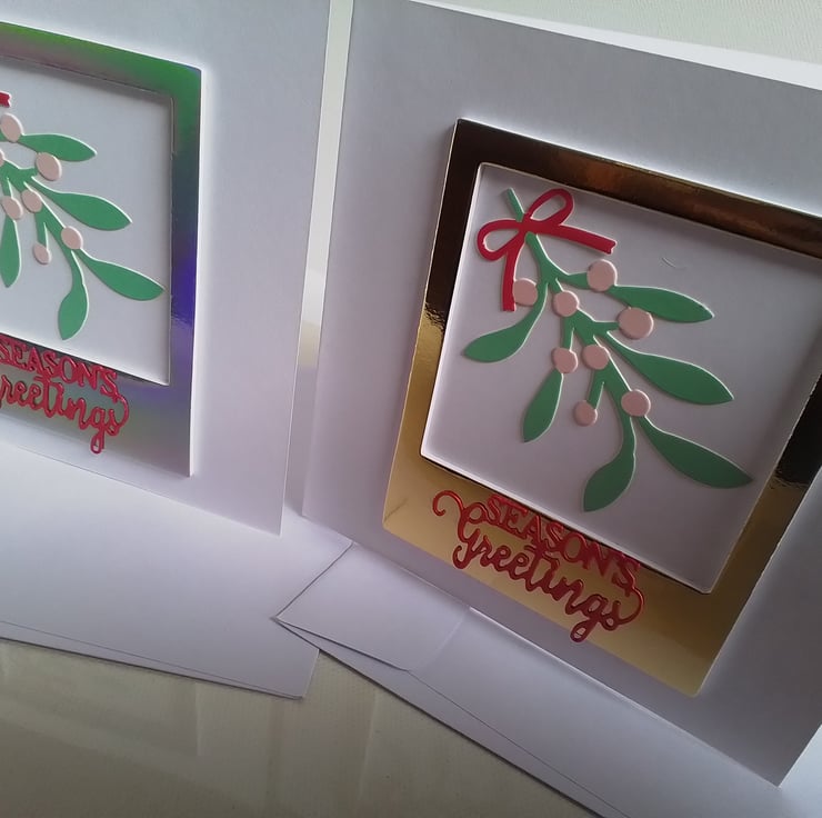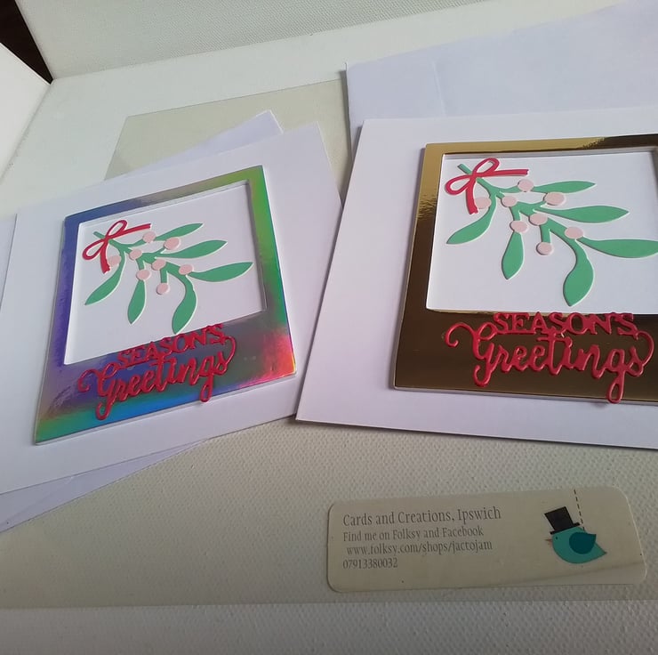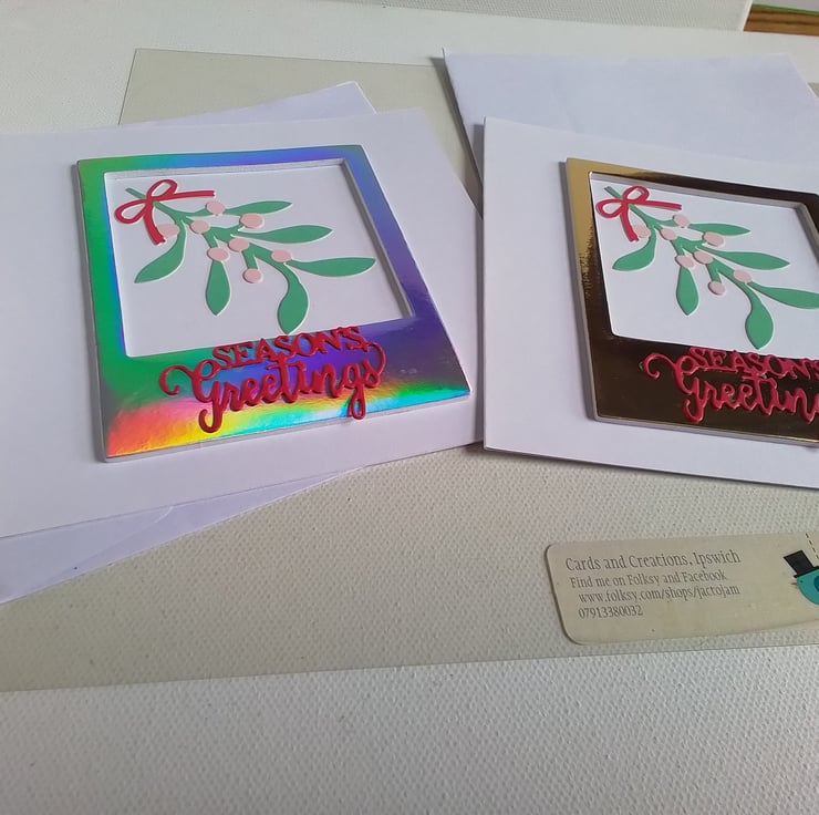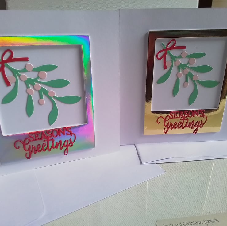 Inside the shiny frame is a sprig of mistletoe and a red Seasons Greeting topper sits on the bottom of the silver frame.