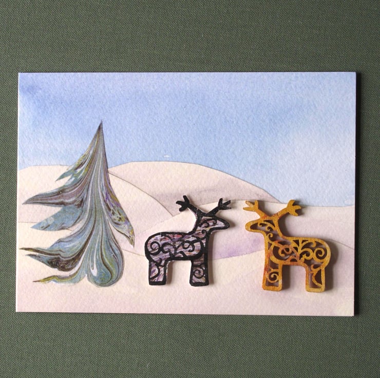 Unique handmade card. The card has an original hand coloured wooden reindeer and hand printed paper one, mounted on a background originally made from cut papers. A6 card, with side fold. Blank inside.
