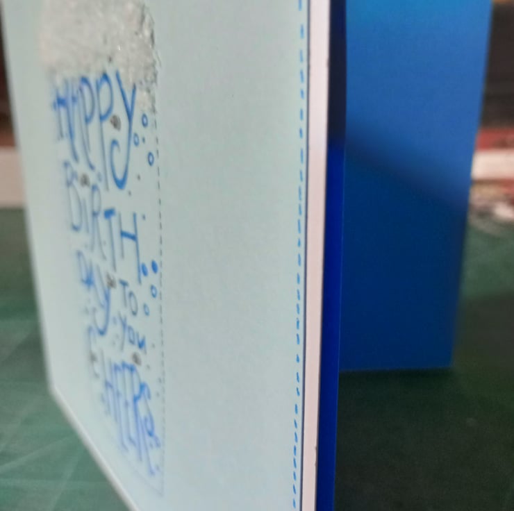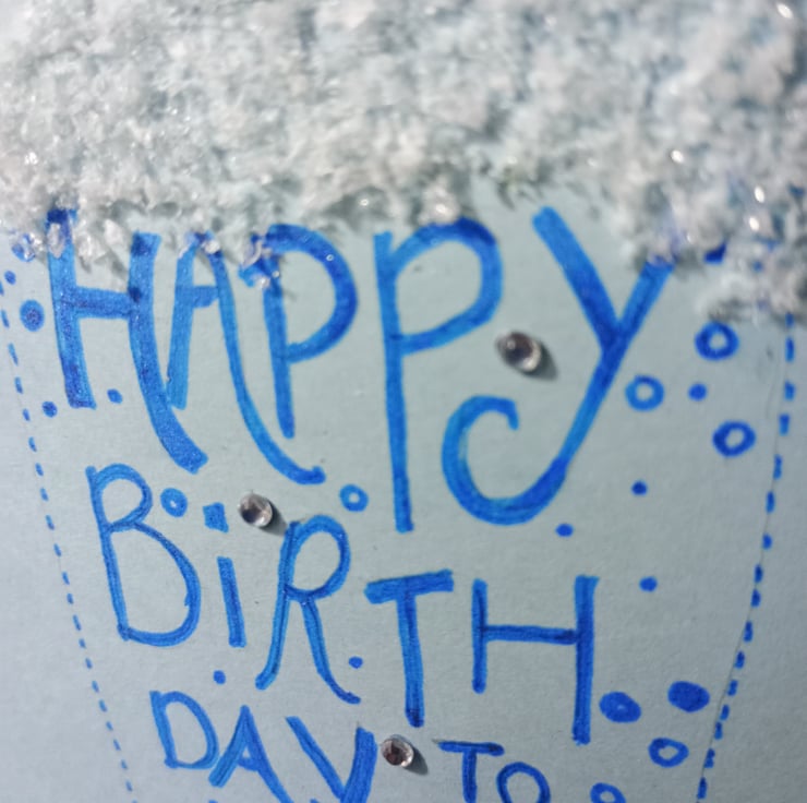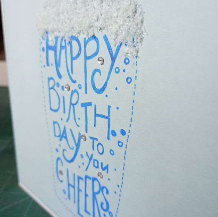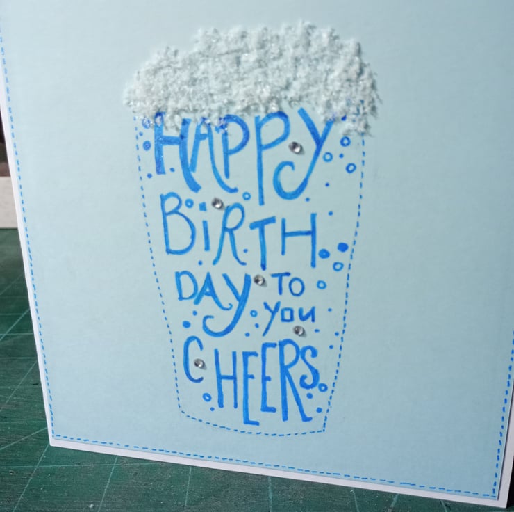 A completely handmade and unique designed card. Consisting of a glass hand drawn in blue. Flower soft for top. Happy birthday to you cheers handwritten. On blue card which is mounted onto quality pristine white card .