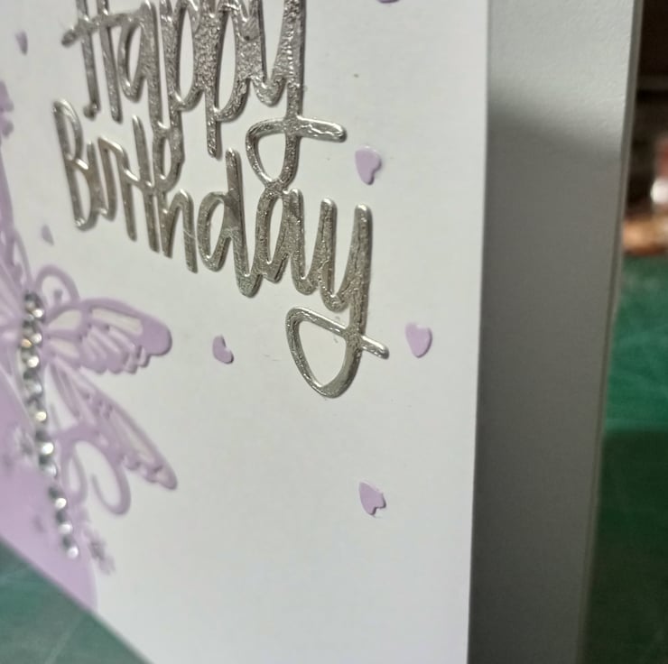 A completely handmade and unique designed card. Consisting of a stunner Ng dragonfly die cut from lilac card. Mounted onto pristine white card. Happy birthday die cut from silver card. Finished off with silver rhinestones for the body and cute silver flower sequins and lilac hearts