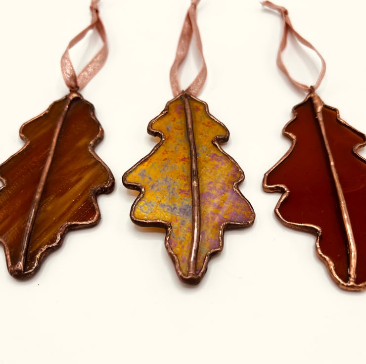 A beautiful stained glass oak leaf in iridescent amber glass with a pretty copper patina, suspended on a sparkly copper blush ribbon.