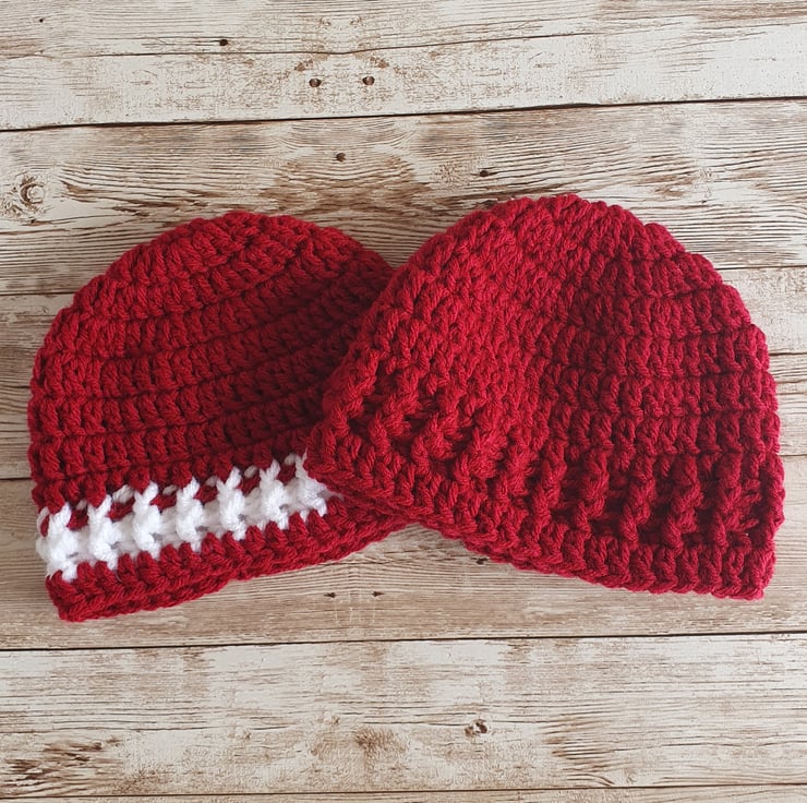 Two Christmas Baby Hats, in Red and White Crochet Beanie Hat in Two Sizes