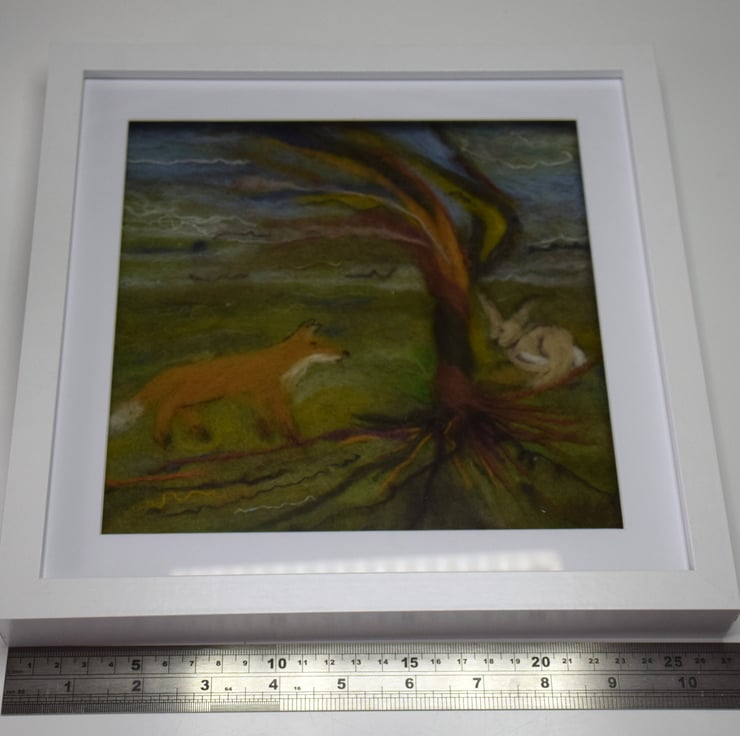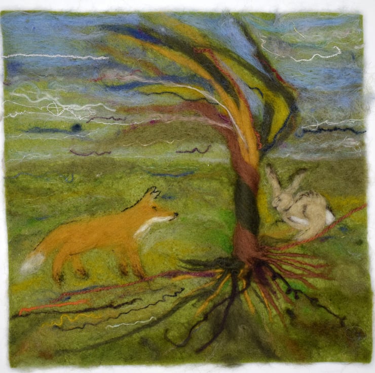 Through the art of wet and dry needle felting I have illustrated the Fable of ‘The Fox and the Hare’ detailing the calm, natural surroundings of the countryside and the interaction between the two wild animals.