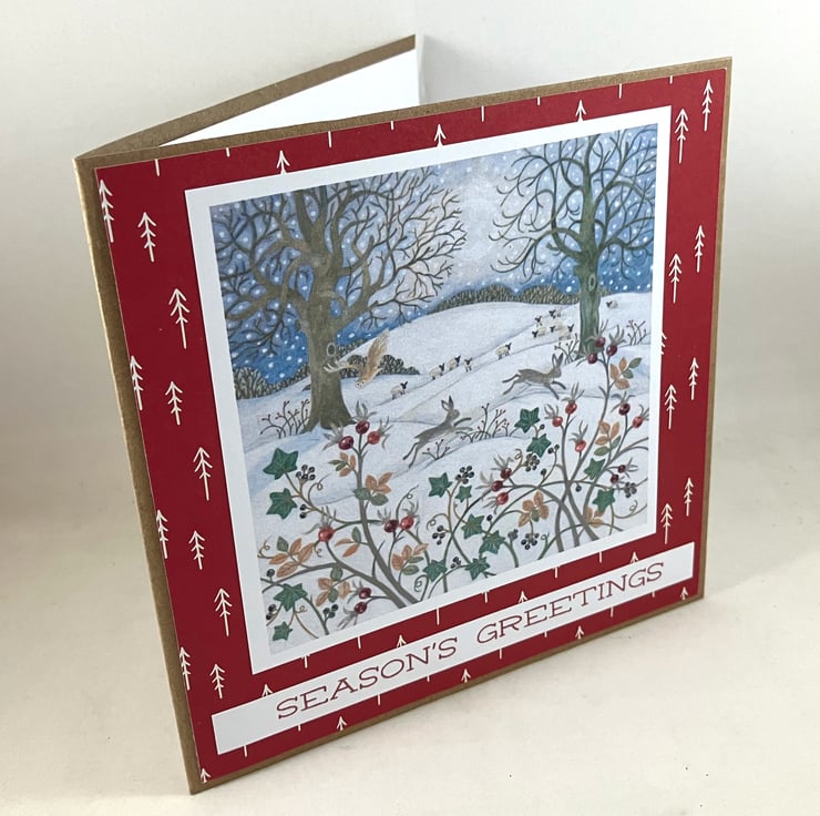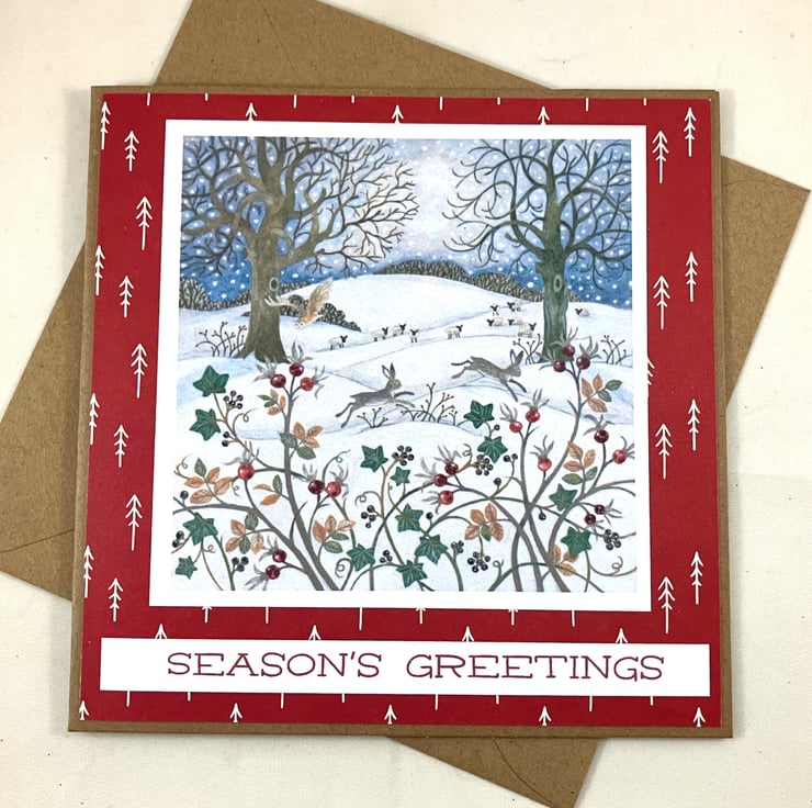 Square, kraft Christmas card featuring a printed image of hares running across snow covered fields with festive ivy and berries in the foreground. The image has been overlaid onto red and white patterned background paper. The sentiment reads: 'Season's Greetings'.