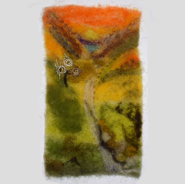 Layers of colourful needle felting and slow stitching depict a wonderful scenic background with a road leading into the valley.